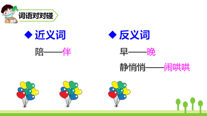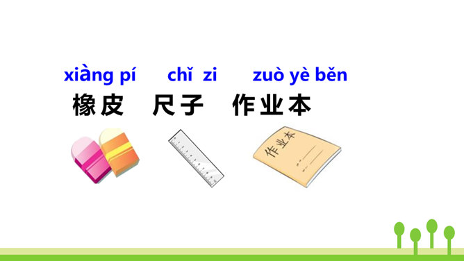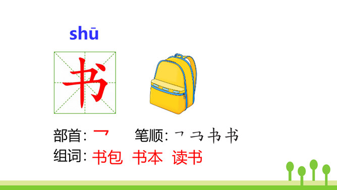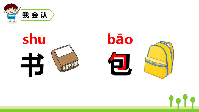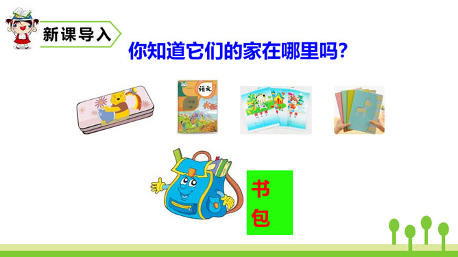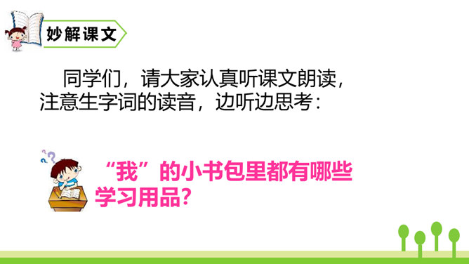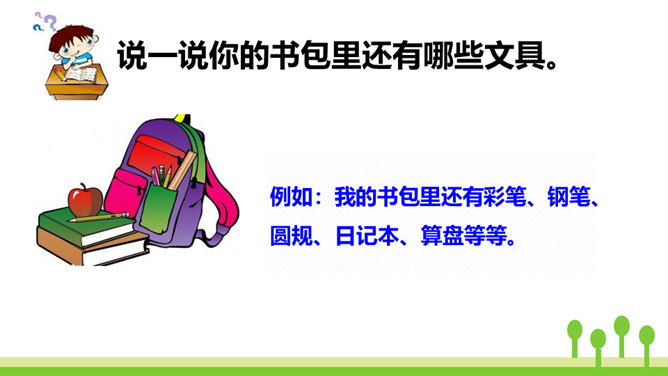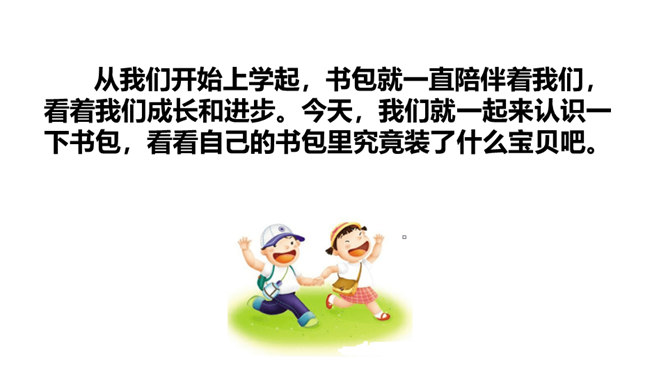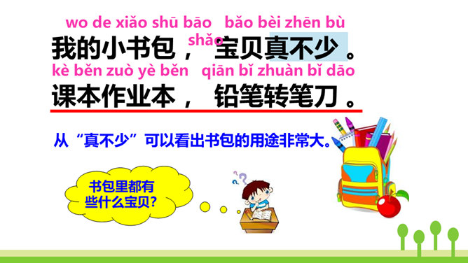 从我们开始上学起,书包就一直陪伴着我们,看着我们成长和进步。今天,我们就一起来认识一下书包,看看自己的书包里究竟装了什么宝贝吧。同学们,请大家认真听课文朗读,注意生字词的读音,边听边思考:“我”的小书包里都有哪些学习用品?本课由插图、6个词语和一首儿歌组成。词语讲的是图中学习用品的名称,儿歌也是围绕图画、词语来写的,告诉我们书包的用途,也要求我们养成整理、爱惜学习用品的好习惯。所属专题:小书包ppt。