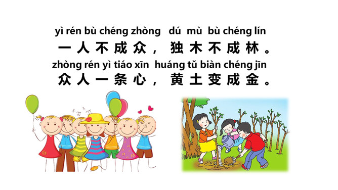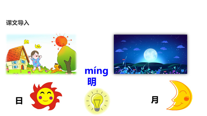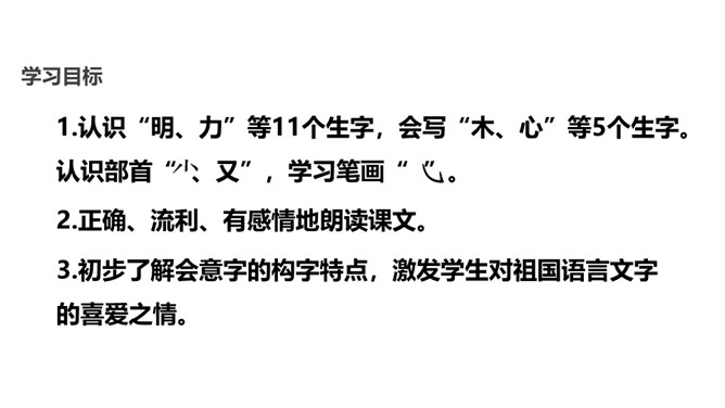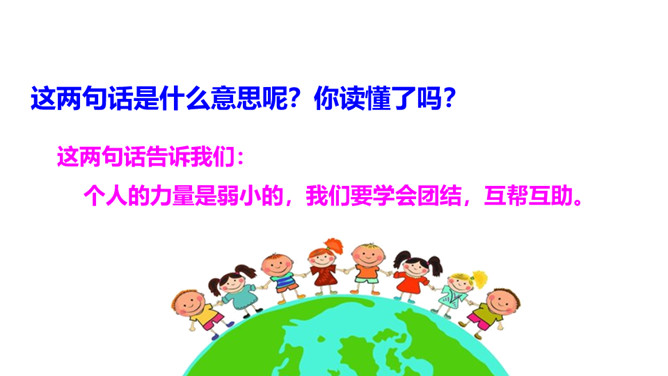 学习目标:1.认识“明、力”等11个生字,会写“木、心”等5个生字。认识部首“ 、又”,学习笔画。2.正确、流利、有感情地朗读课文。3.初步了解会意字的构字特点,激发学生对祖国语言文字的喜爱之情。这两句话是什么意思呢?你读懂了吗?这两句话告诉我们:个人的力量是弱小的,我们要学会团结,互帮互助。所属专题:日月明ppt。