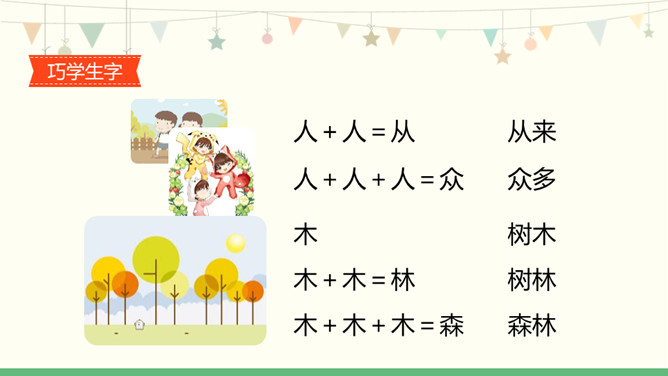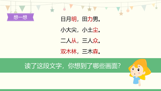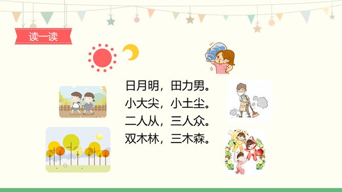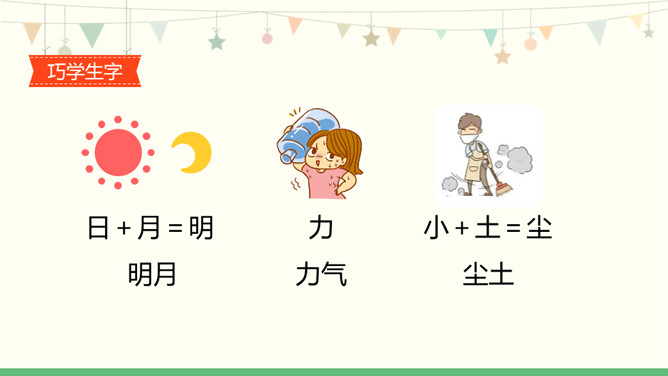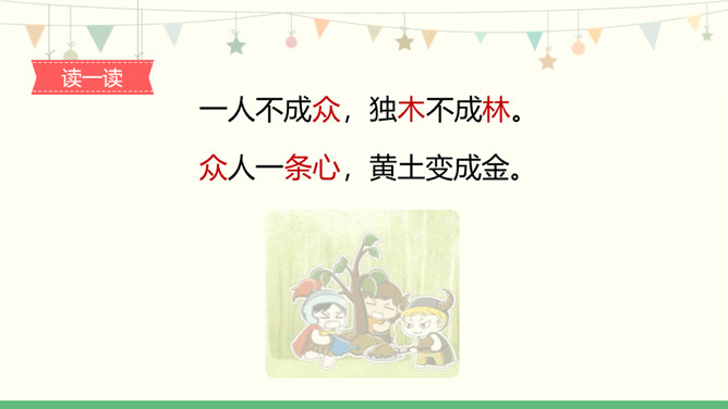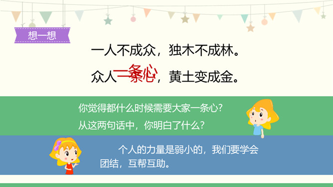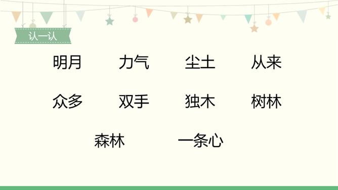你觉得都什么时候需要大家一条心?从这两句话中,你明白了什么?个人的力量是弱小的,我们要学会团结,互帮互助。认一认:明月 力气 尘土 从来 众多 双手 独木 树林 森林 一条心。读了这段文字,你想到了哪些画面?所属专题:日月明ppt。