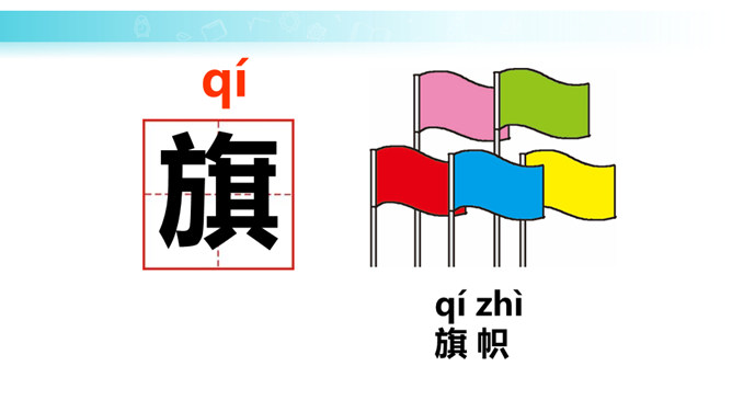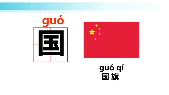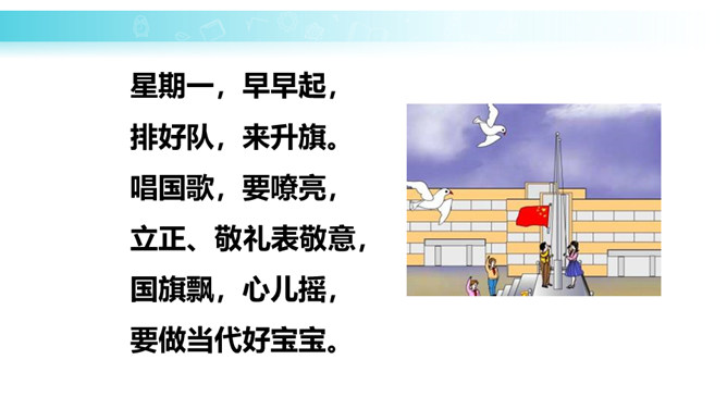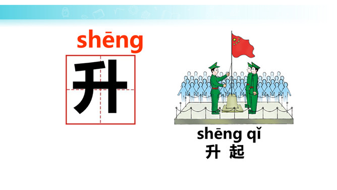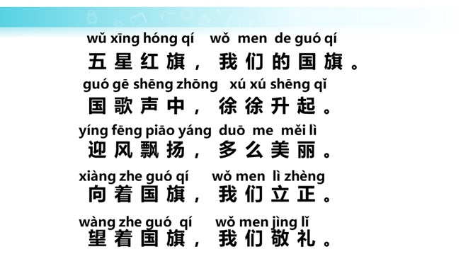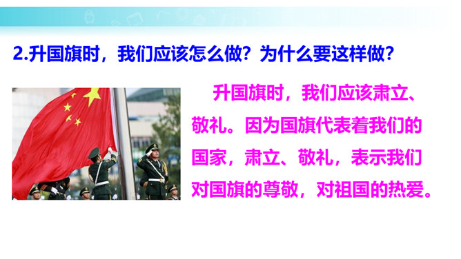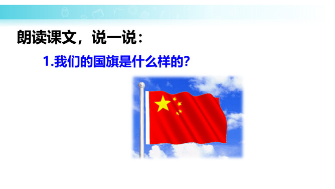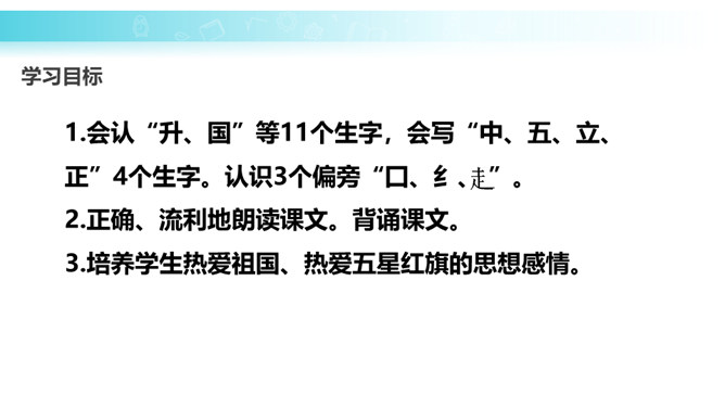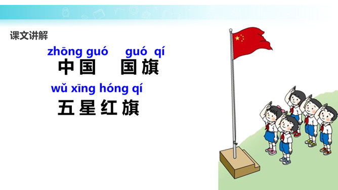 学习目标:培养学生热爱祖国、热爱五星红旗的思想感情。正确、流利地朗读课文。背诵课文。会认“升、国”等11个生字,会写“中、五、立、正”4个生字。认识3个偏旁囗、纟。朗读课文,说一说:1.我们的国旗是什么样的?2.升国旗时,我们应该怎么做?为什么要这样做?升国旗时,我们应该肃立、敬礼。因为国旗代表着我们的国家,肃立、敬礼,表示我们对国旗的尊敬,对祖国的热爱。所属专题:升国旗ppt。