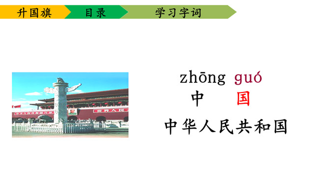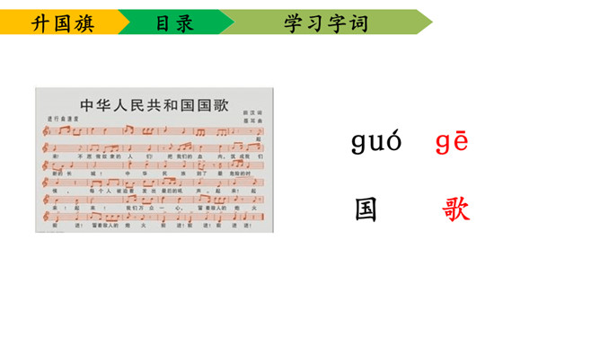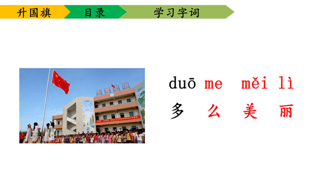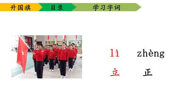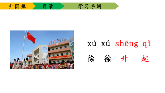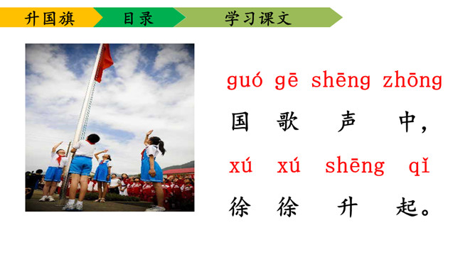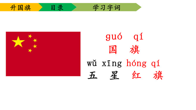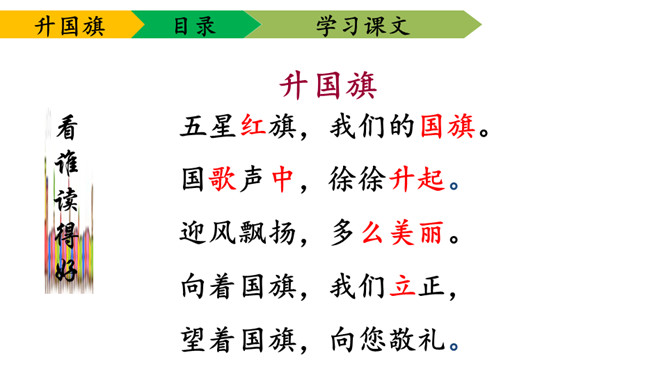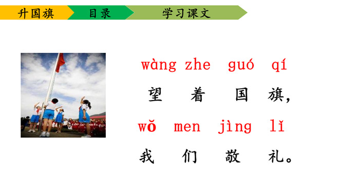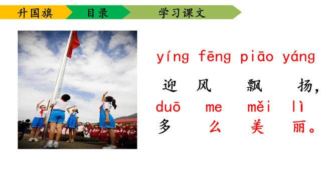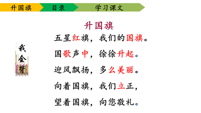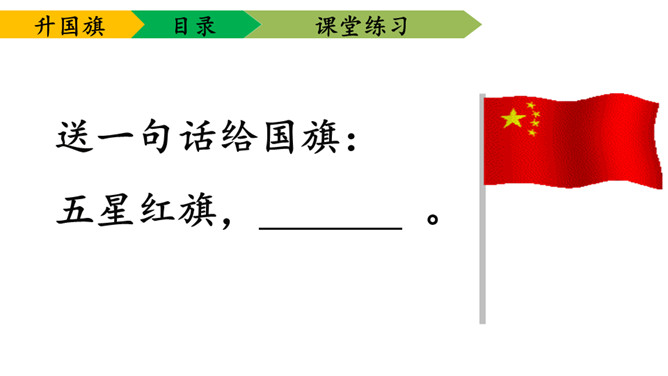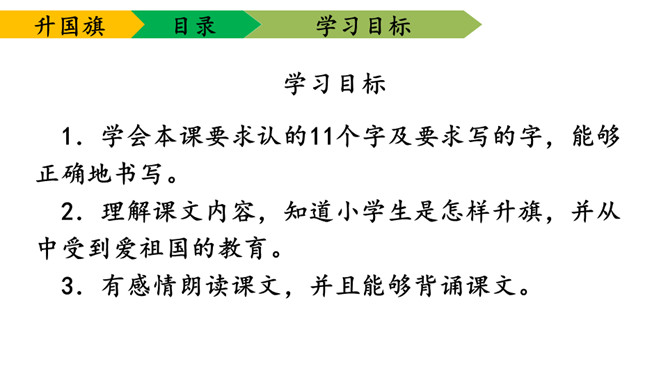 1.学会本课要求认的11个字及要求写的字,能够正确地书写。2.理解课文内容,知道小学生是怎样升旗,并从中受到爱祖国的教育。3.有感情朗读课文,并且能够背诵课文。送一句话给国旗:五星红旗,( )。1、背诵课文。2、阅读《国旗国旗真美丽》。所属专题:升国旗ppt。