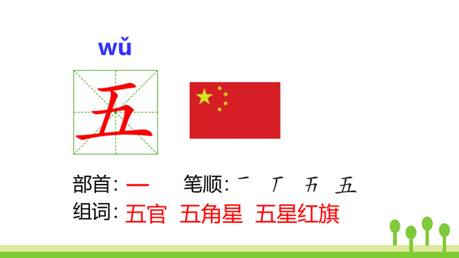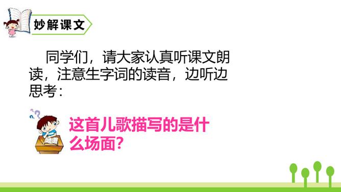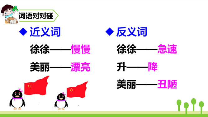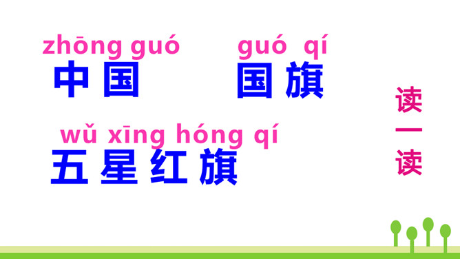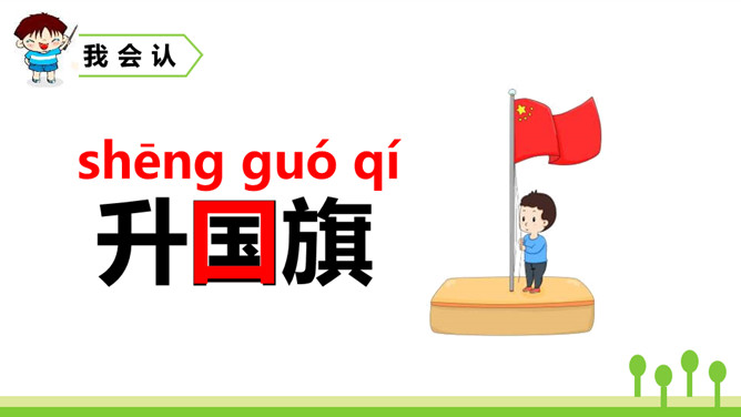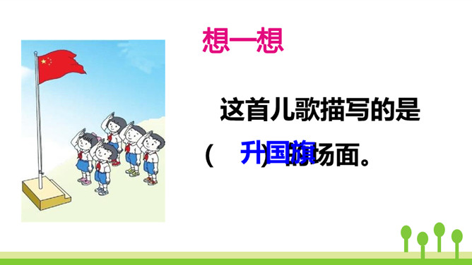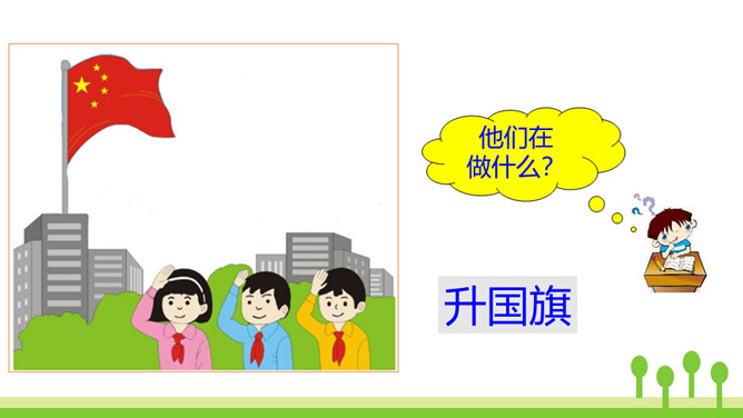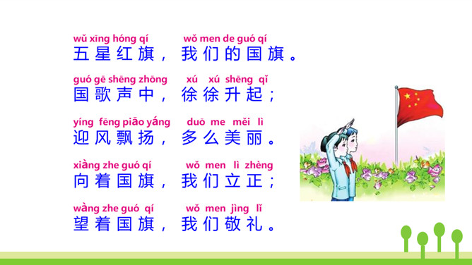 同学们,请大家认真听课文朗读,注意生字词的读音,边听边思考:这首儿歌描写的是什么场面?你能说说五星红旗是怎样的吗?五星红旗:旗面为红色,左上方有五颗星,一颗大,四颗小。小星各有一尖角正对着大五角星的中心点。本课是由3个词语和一首清新自然、简洁易懂的儿歌组成,描述了少先队员升旗的场景,告诉我们五星红旗是我们的国旗,在升国旗时要(奏国歌)、要面向国旗(立正)、(敬礼)的知识。所属专题:升国旗ppt。