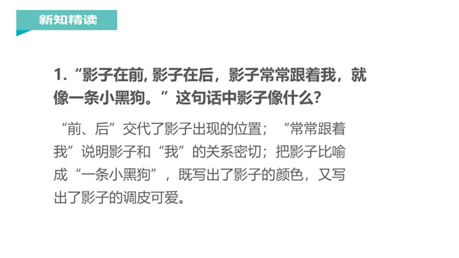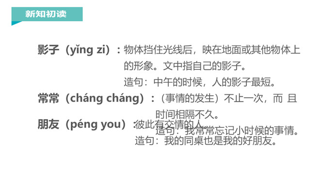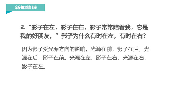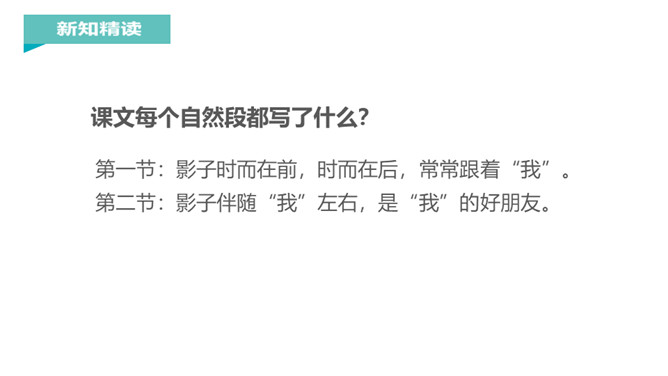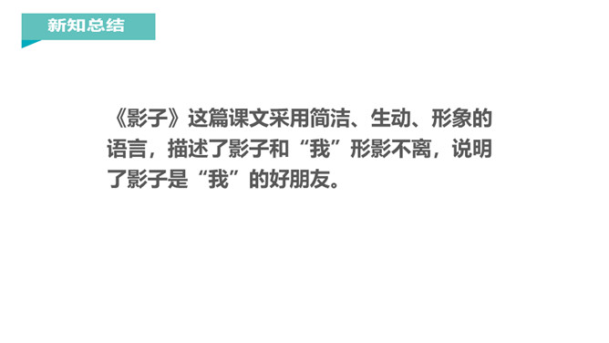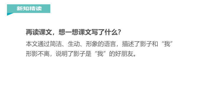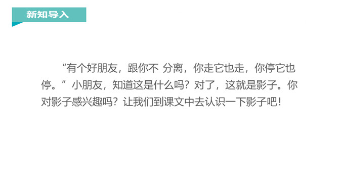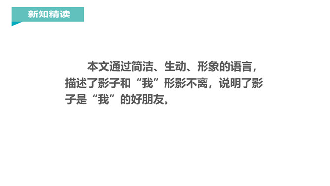 “有个好朋友,跟你不分离,你走它也走,你停它也停。”小朋友,知道这是什么吗?对了,这就是影子。你对影子感兴趣吗?让我们到课文中去认识一下影子吧!课文每个自然段都写了什么?第一节:影子时而在前,时而在后,常常跟着“我”。第二节:影子伴随“我”左右,是“我”的好朋友。再读课文,想一想课文写了什么?本文通过简洁、生动、形象的语言,描述了影子和“我”形影不离,说明了影子是“我”的好朋友。所属专题:影子ppt。