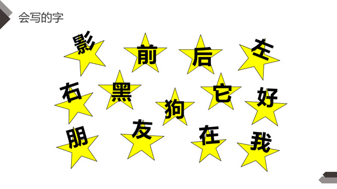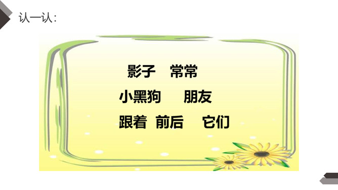 《影子》部编版语文课件 一年级上册。影 前 后 左 右 黑 狗 它 好 朋 友 在 我 。读一读:影子/常常/跟着我,就/像/一只/小黑狗。影子/常常/陪着我,它/是/我的/好朋友。所属专题:影子ppt。