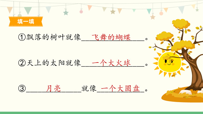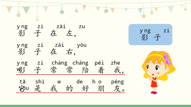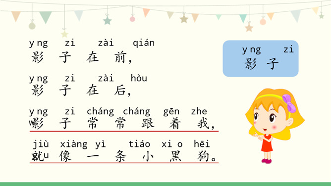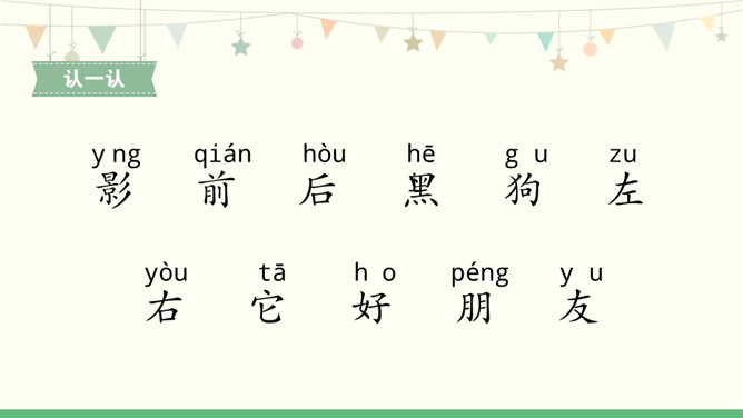 认一认:影 前 后 黑 狗 左 右 它 好 朋 友。读一读:影子 左右 小黑狗 好朋友 前后 它们。①飘落的树叶就像飞舞的蝴蝶 。②天上的太阳就像一个大火球。③月亮就像一个大圆盘。所属专题:影子ppt。
