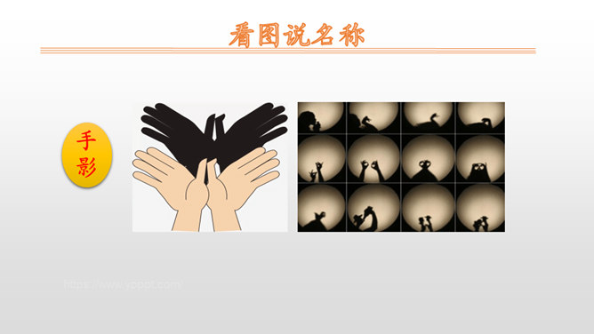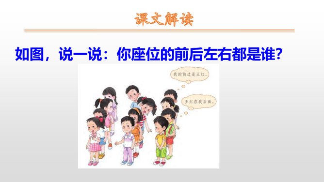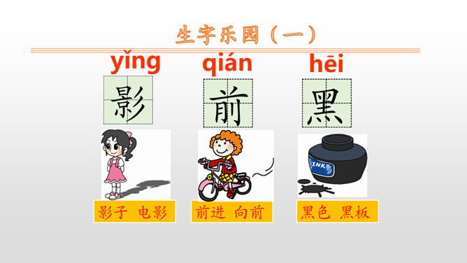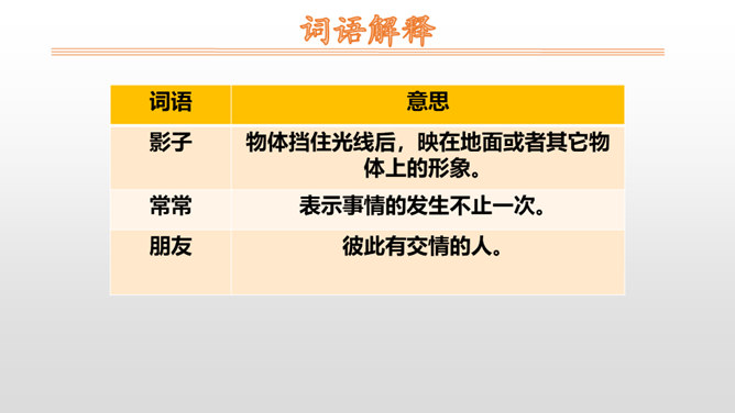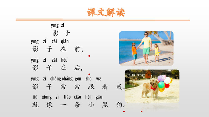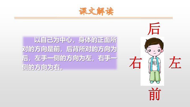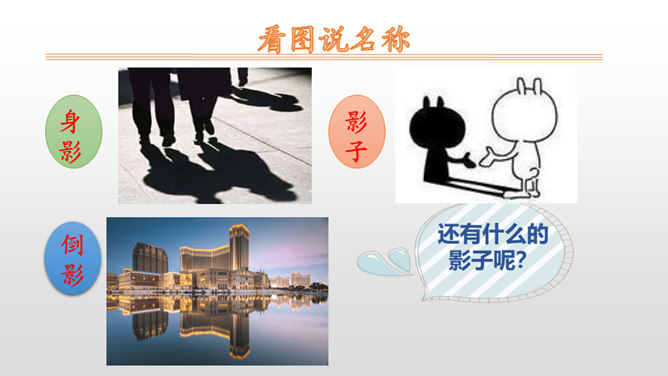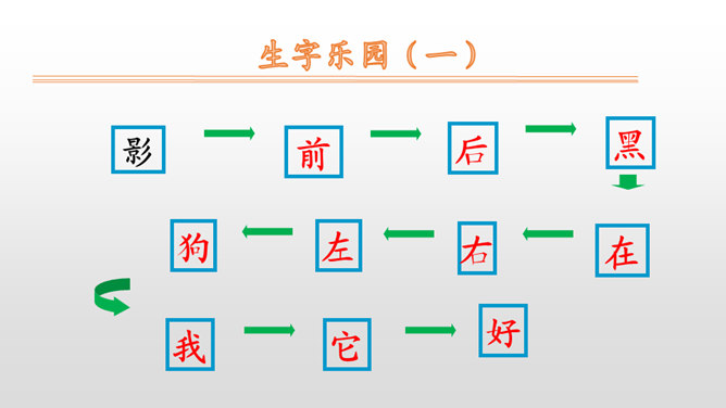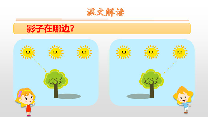 朗读课文,读准字音。解析 本文的总体朗读基调是欢快、俏皮的,两小节的句式结构相似,比较简单。可边做动作边练习朗读。朗读时,先读准字音,“常、着、是”是翘舌音,不要读成平舌音;“着、子”读轻声;“子、在、左”是平舌音,不要读成翘舌音。要重读表示影子出现的位置的词和表现影子形状的词,语速稍快,表现出影子的调皮可爱。你的前后左右都是谁?这道题要以自己为中心,身体的正面所对的方向为前,后背所对的方向为后,左手一侧的方向为左,右手一侧的方向为右。知道这些后,再看看、说说。所属专题:影子ppt。