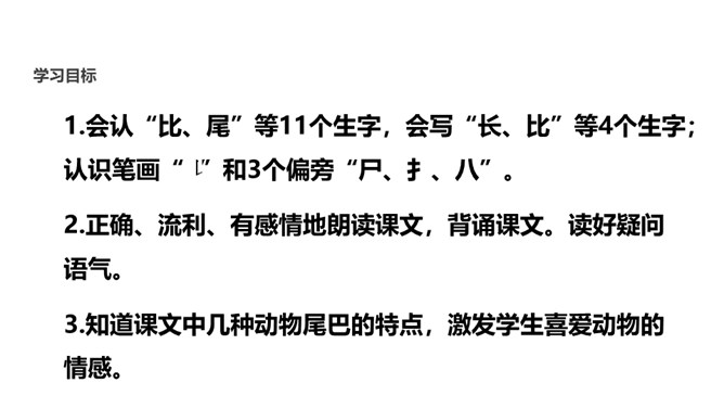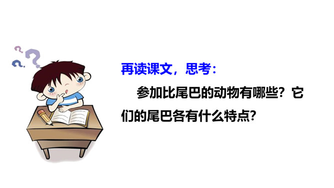 小动物的尾巴各种各样,有的长,有的短,有的弯,有的扁,还有的动物有着非常漂亮的尾巴。今天动物王国要举行一年一度的尾巴比赛,如果你是评委,会选谁当冠军呢?先让我们看看,到底来了哪些动物朋友吧!再读课文,思考:参加比尾巴的动物有哪些?它们的尾巴各有什么特点?世界上生活着许多动物。大部分动物的身上都有一条尾巴,它们形状各异,功能也各不相同。你还认识哪些动物的尾巴?所属专题:比尾巴ppt。