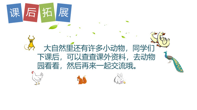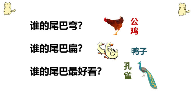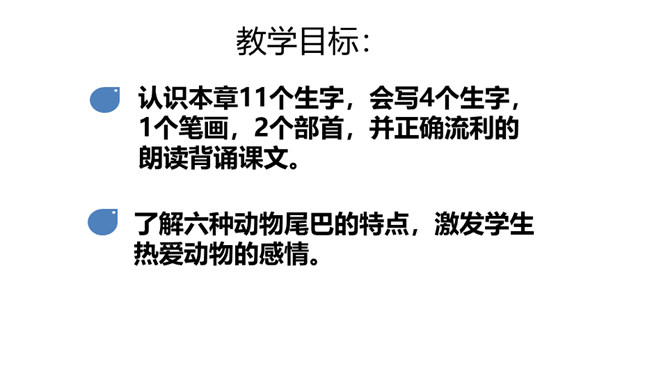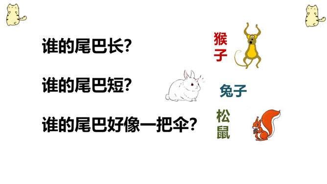 教学目标:认识本章11个生字,会写4个生字,1个笔画,2个部首,并正确流利的朗读背诵课文。了解六种动物尾巴的特点,激发学生热爱动物的感情。谁的尾巴长?谁的尾巴短?谁的尾巴好像一把伞?谁的尾巴弯?谁的尾巴扁?谁的尾巴最好看?大自然里还有许多小动物,同学们下课后,可以查查课外资料,去动物园看看,然后再来一起交流哦。所属专题:比尾巴ppt。