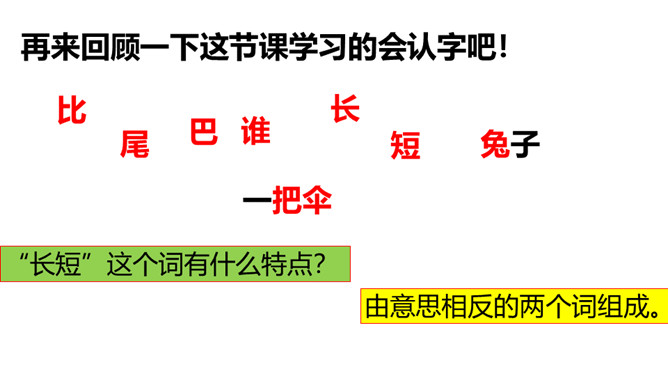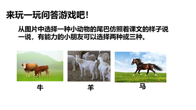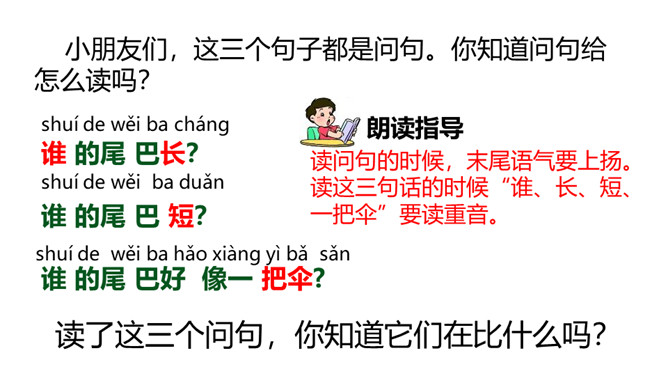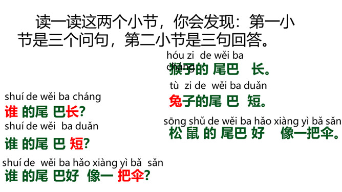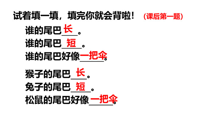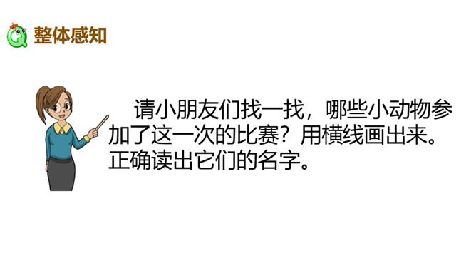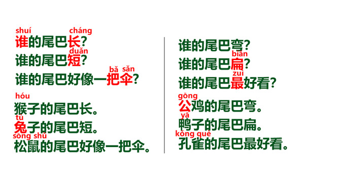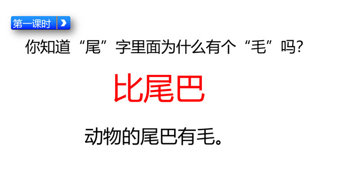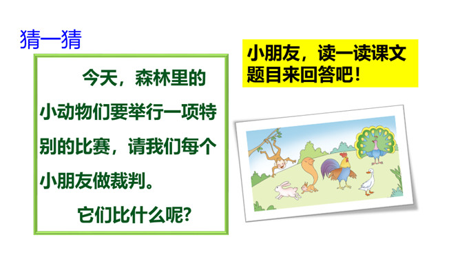 请小朋友们自由读课文,圈画出你不认识的字,借助拼音把他们读正确。请小朋友们找一找,哪些小动物参加了这一次的比赛?用横线画出来。正确读出它们的名字。我们看一看第一组参加比赛的小动物在课文哪几个小节?学完第一课时后,大家能背诵课文第一、二小节了吗?和老师一起来背一背吧!今天这节课,我们要来看看第二组小动物比尾巴的情况。自由读第三、四小节,想一想,谁参加了第二组的比尾巴大赛?所属专题:比尾巴ppt。