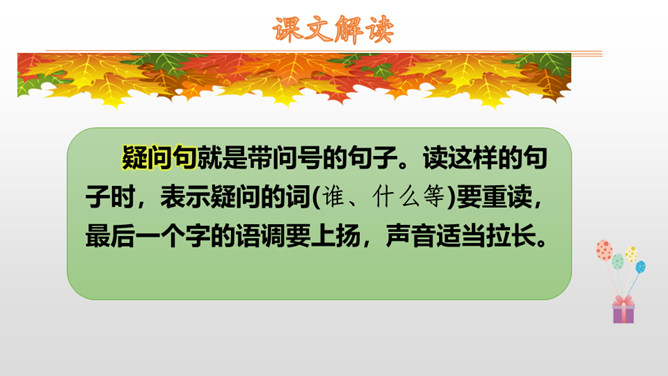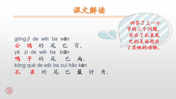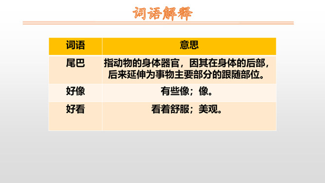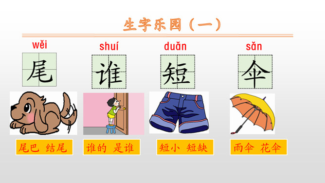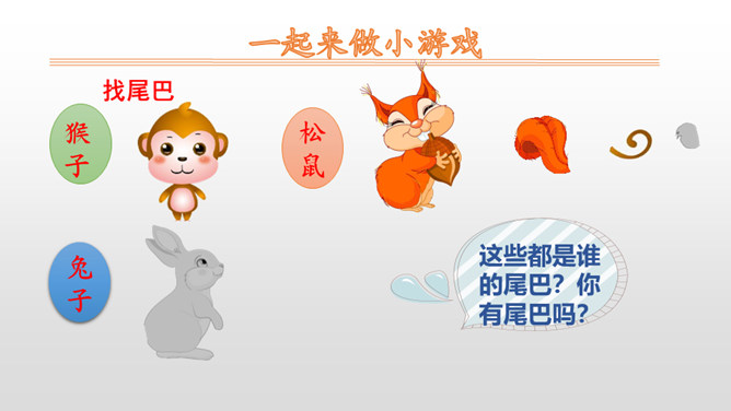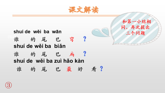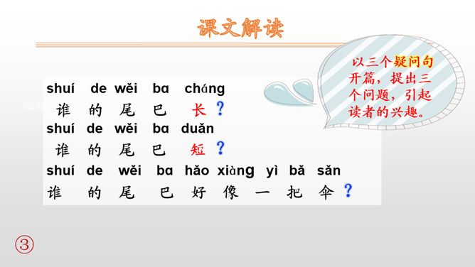 朗读课文。背诵课文。(1)朗读课文解析 本篇课文整体的朗读基调是轻松、欢快、俏皮的,就像两个小朋友在一问一答,做猜谜游戏。要着重读好问句:先读准句子中易读错的字,如“谁”;再读好一些词语中的轻声,如“谁的、尾巴”等;最后读好问句末尾词语的升调,如“长”“短”“一把伞”等。《比尾巴》这首儿歌,共有四个小节,一、二节和三、四节在结构形式上是一样的,课文采用“三问三答”的形式介绍了六种动物尾巴的特点。所属专题:比尾巴ppt。