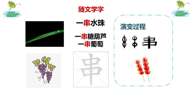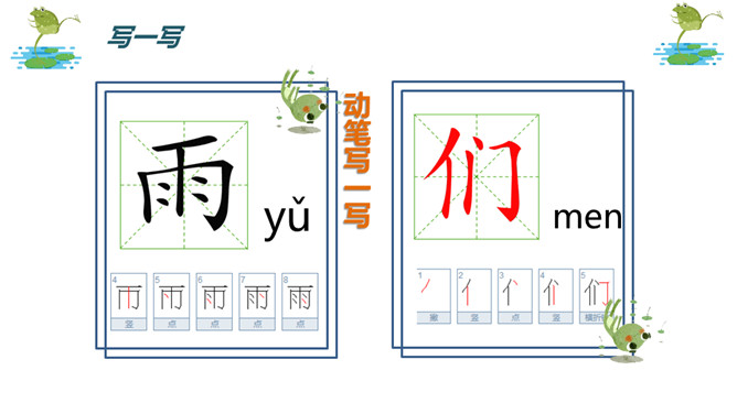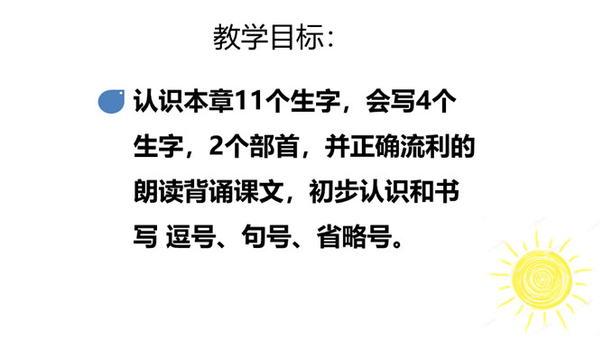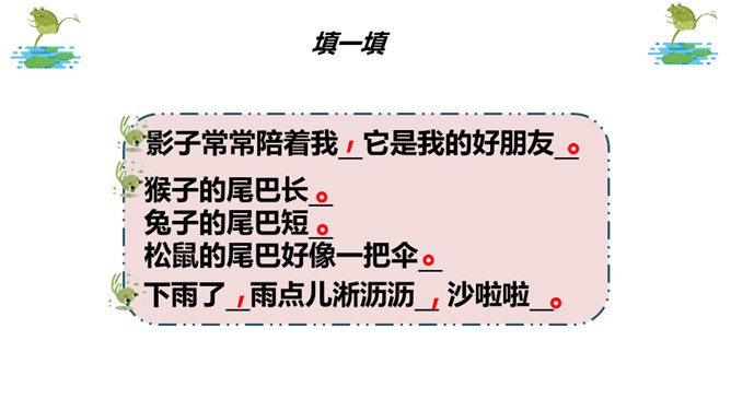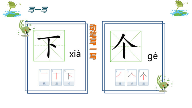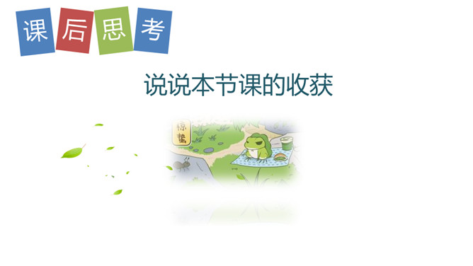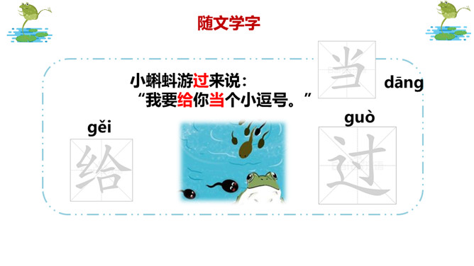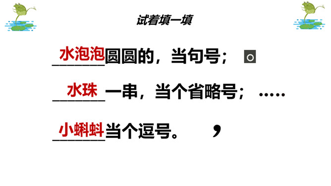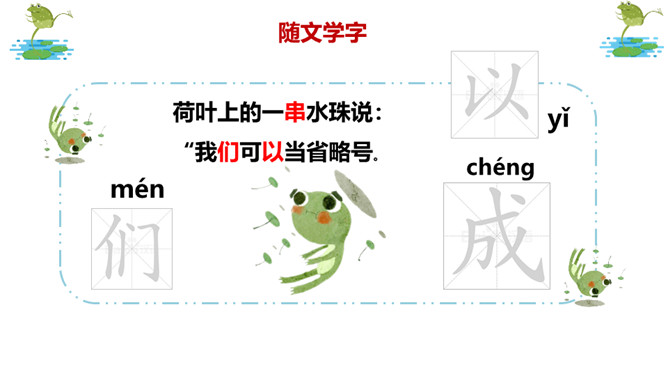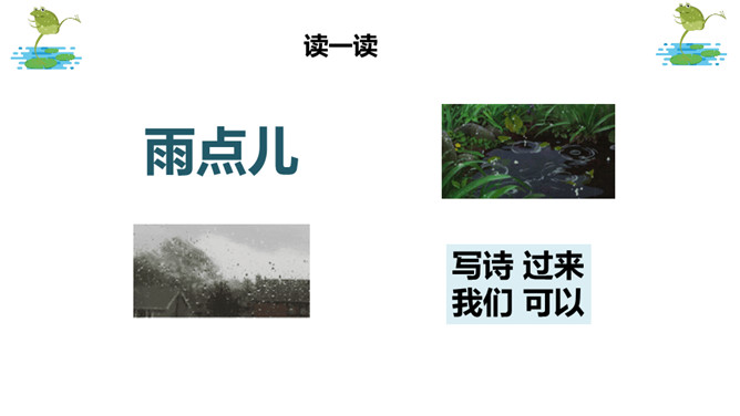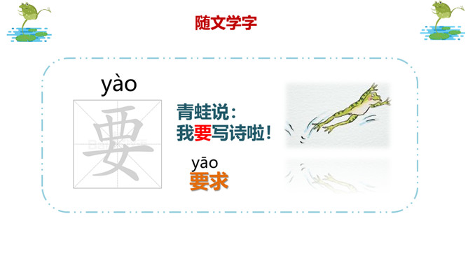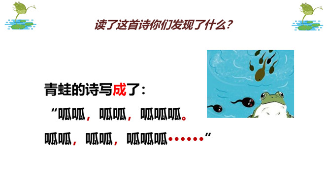 教学目标:认识本章11个生字,会写4个生字,2个部首,并正确流利的朗读背诵课文,初步认识和书写 逗号、句号、省略号。读了这首诗你们发现了什么?青蛙的诗写成了:“呱呱,呱呱,呱呱呱。呱呱,呱呱,呱呱呱······”试着填一填。说说本节课的收获。所属专题:青蛙写诗ppt。