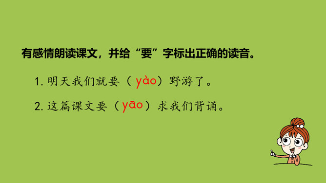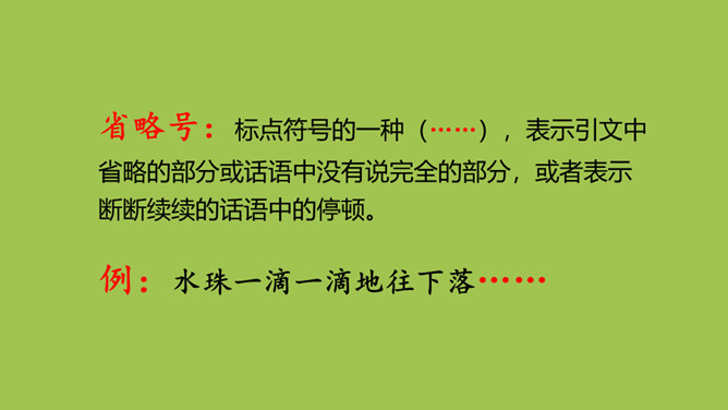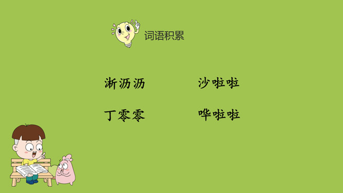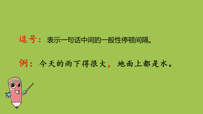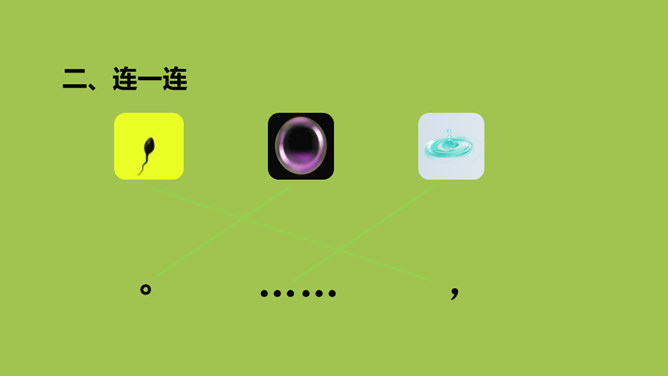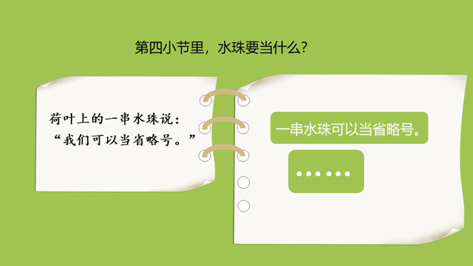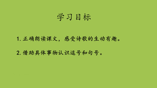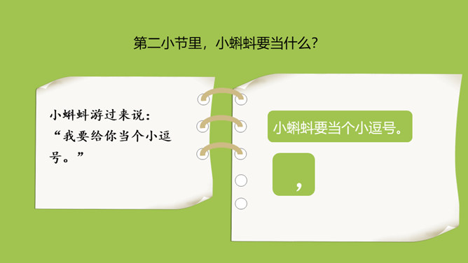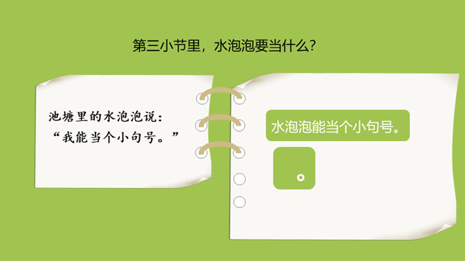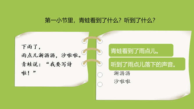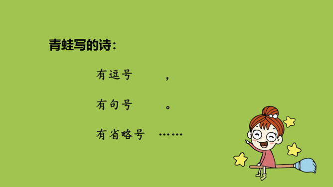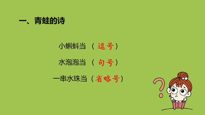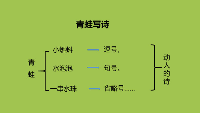 学习目标:1.正确朗读课文,感受诗歌的生动有趣。2.借助具体事物认识逗号和句号。有感情朗读课文,并给“要”字标出正确的读音。第一小节里,青蛙看到了什么?听到了什么?青蛙看到了雨点儿。听到了雨点儿落下的声音。第二小节里,小蝌蚪要当什么?小蝌蚪要当个小逗号。逗号:表示一句话中间的一般性停顿间隔。第三小节里,水泡泡要当什么?水泡泡能当个小句号。第四小节里,水珠要当什么?一串水珠可以当省略号。所属专题:青蛙写诗ppt。