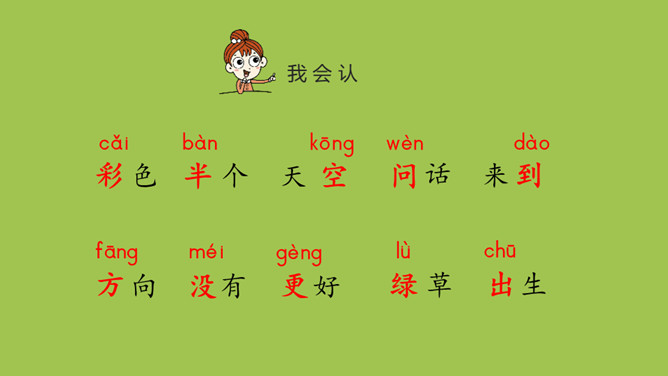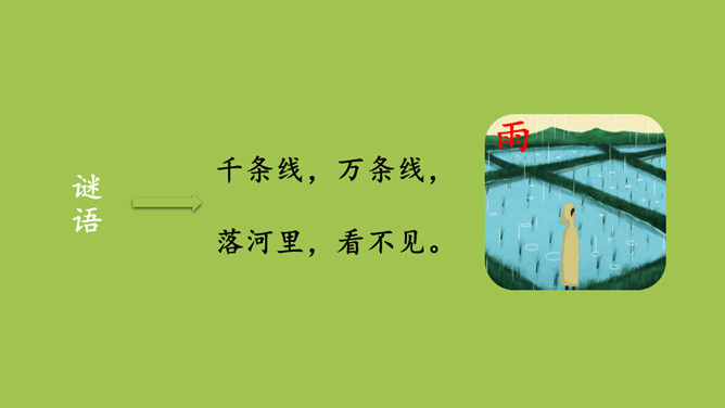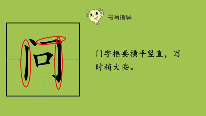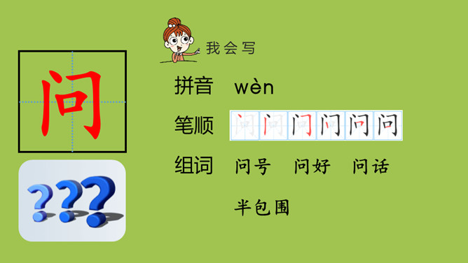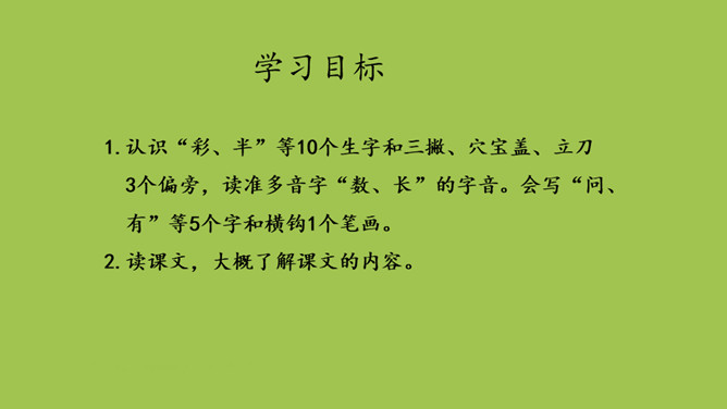 1.认识“彩、半”等10个生字和三撇、穴宝盖、立刀3个偏旁,读准多音字“数、长”的字音。会写“问、有”等5个字和横钩1个笔画。2.读课文,大概了解课文的内容。课文一共有几个自然段?全文一共有五个自然段。门字框要横平竖直,写时稍大些。第一笔横长一些,撇从竖中线上起笔,要写得舒展。第二横要比第一横长。竖要写在竖中线上,要写直。两个“人” ,左边的要比右边的稍窄。所属专题:雨点儿ppt。