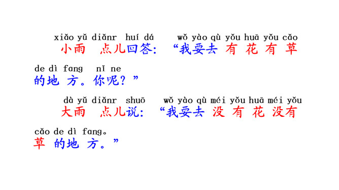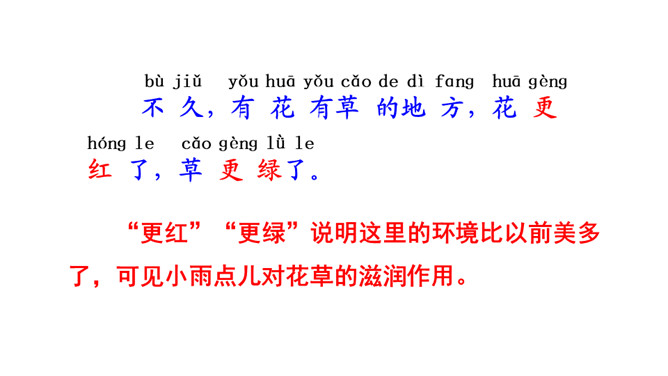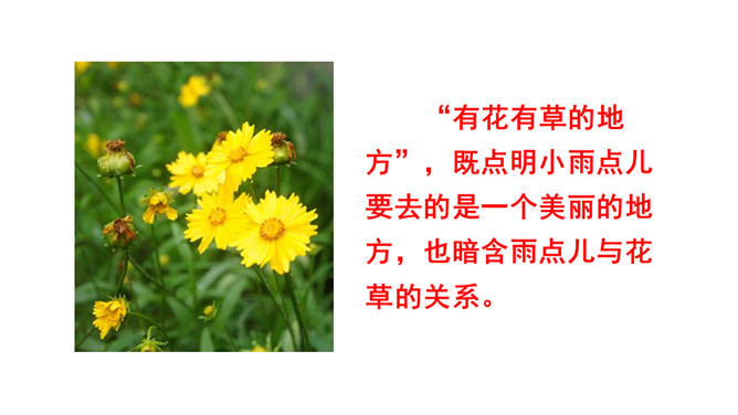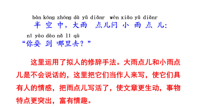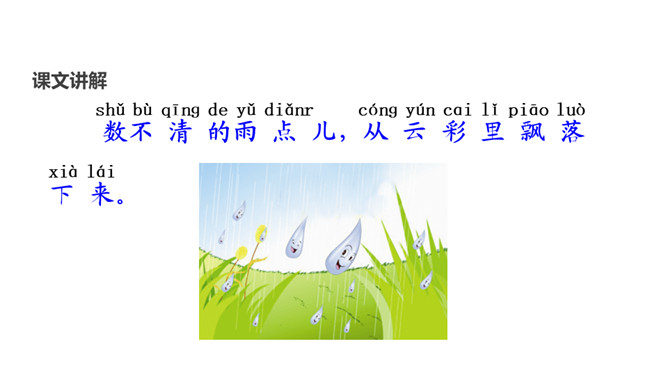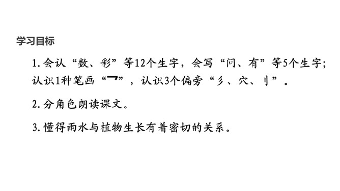 1.会认“数、彩”等12个生字,会写“问、有”等5个生字;认识1种笔画“乛”,认识3个偏旁“彡、穴、刂”。2.分角色朗读课文。3.懂得雨水与植物生长有着密切的关系。雨点儿像是来自天上的精灵,它们争先恐后地飘向大地,满怀喜悦地去滋润万物,悄无声息地执行着自己神圣的使命。让我们走进课文,去听听大雨点儿和小雨点儿的对话吧!这里运用了拟人的修辞手法。大雨点儿和小雨点儿是不会说话的,这里把它们当作人来写,使它们具有人的情感,把雨点儿写活了,使文章更生动,事物特点更突出,富有情趣。所属专题:雨点儿ppt。