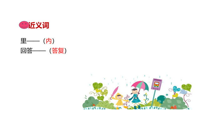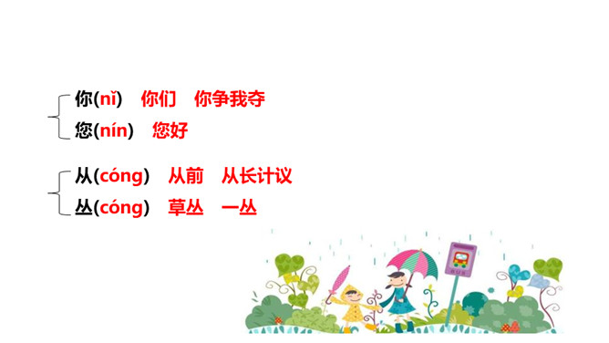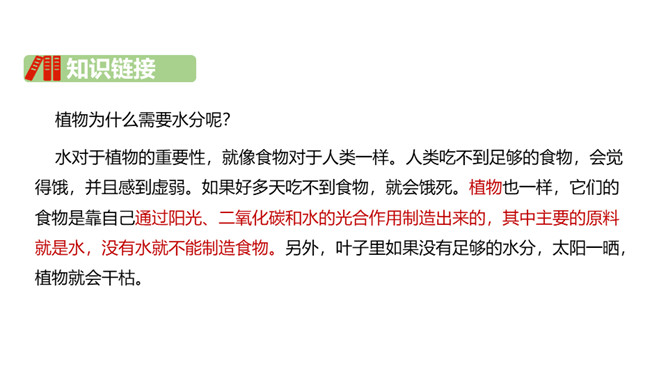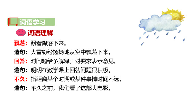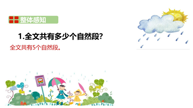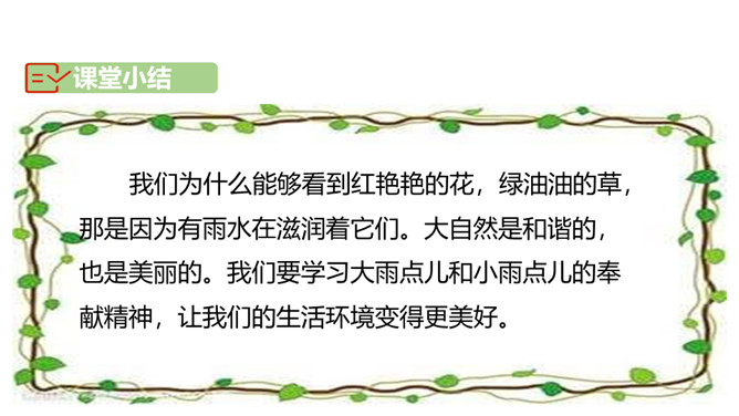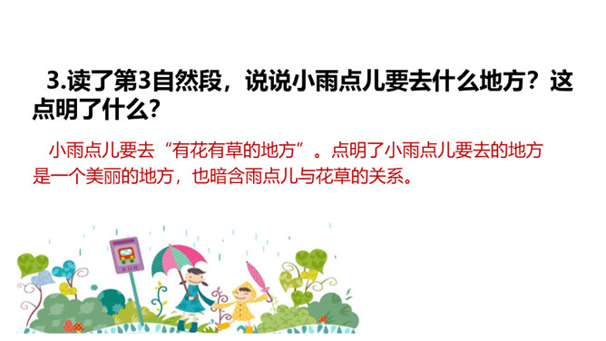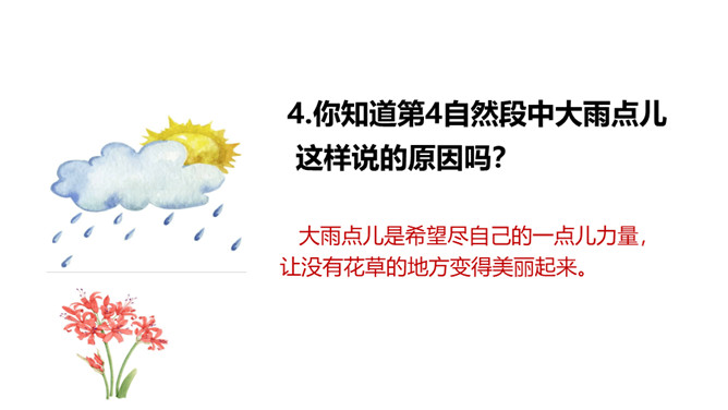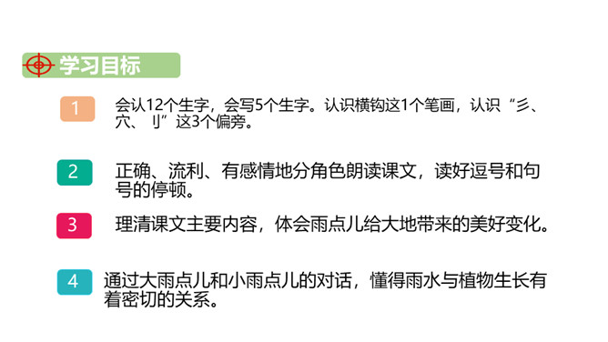 会认12个生字,会写5个生字。认识横钩这1个笔画,认识“彡、穴、刂”这3个偏旁。正确、流利、有感情地分角色朗读课文,读好逗号和句号的停顿。理清课文主要内容,体会雨点儿给大地带来的美好变化。为什么“有花有草的地方,花更红了,草更绿了。没有花没有草的地方,开出了红的花,长出了绿的草”?因为大雨点儿、小雨点儿起了作用。说明雨水与植物之间有着密切的关系,植物生长离不开水。所属专题:雨点儿ppt。