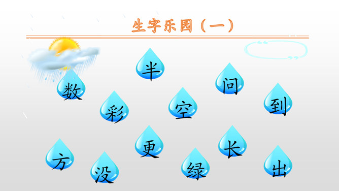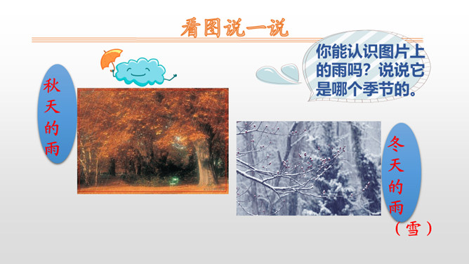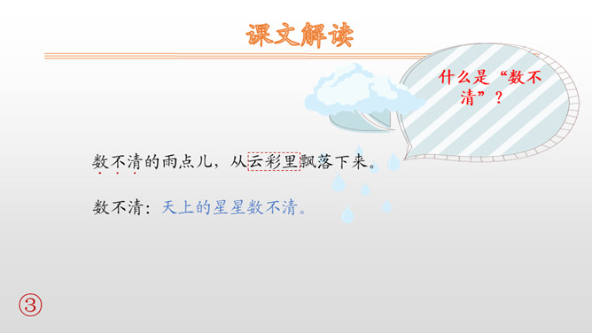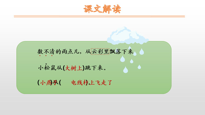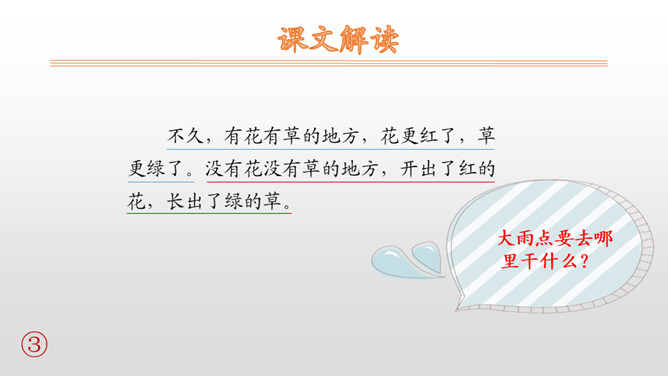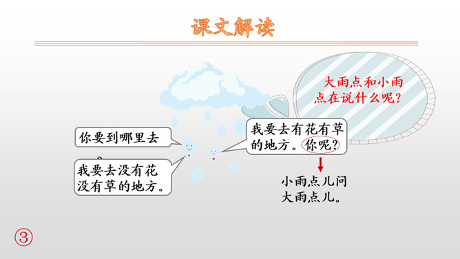 本文是一篇科学童话。课文用拟人化的手法,通过大雨点儿和小雨点儿的对话,告诉学生雨点儿是从云彩里飘落下来的,有了雨水的滋润,花更红了,草更绿了;有了雨点儿的滋润,才有草长花开的美丽景象。 本文是以大雨点儿和小雨点儿的对话展开故事情节的,适合分角色朗读。注意读好对话,要重点读好疑问句的语气。朗读时,要注意“雨点儿”不能读成三个音节,“点儿”的读法是在“点”的后面加一个卷舌动作。最后一个自然段写得很美,读的时候,语速稍慢,注意“更”“红”“绿”要重读,一边读一边想象雨后田野的美丽景色。所属专题:雨点儿ppt。