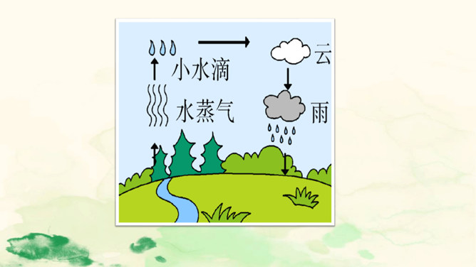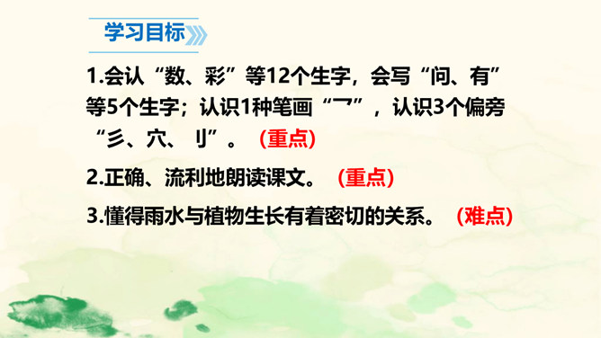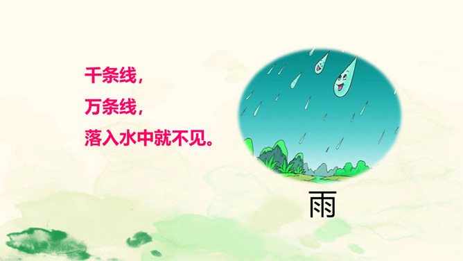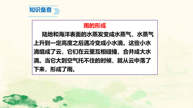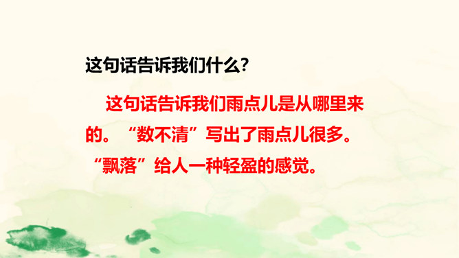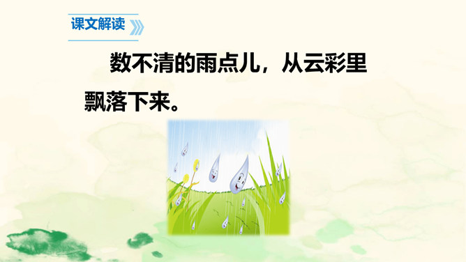 雨点儿像是来自天上的精灵,它们争先恐后地飘向大地,满怀喜悦地去滋润万物,悄无声息地执行着自己神圣的使命。让我们走进课文,去听听大雨点儿和小雨点儿的对话吧!这句话告诉我们雨点儿是从哪里来的。“数不清”写出了雨点儿很多。“飘落”给人一种轻盈的感觉。这里运用了拟人的修辞手法。大雨点儿和小雨点儿是不会说话的,这里把它们当作人来写,使它们具有人的情感,把雨点儿写活了,使文章更生动,事物特点更突出,富有情趣。所属专题:雨点儿ppt。