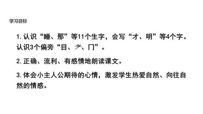 1.认识“睡、那”等11个生字,会写“才、明”等4个字。认识3个偏旁“目 、冂”。2.正确、流利、有感情地朗读课文。3.体会小主人公期待的心情,激发学生热爱自然、向往自然的情感。远足,是一种长途步行运动,也可理解为郊游。大家去郊游过吗?如果明天就要远足,你会是怎样的心情呢?有位作者把要远足的心情写成一首小诗《明天要远足》,让我们一起来读读吧!作者在想些什么?此时的心情是怎样的?所属专题:明天要远足ppt。