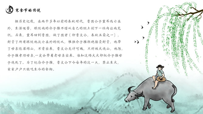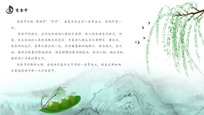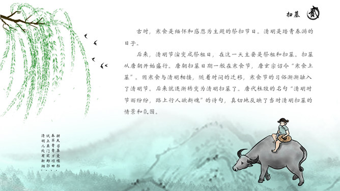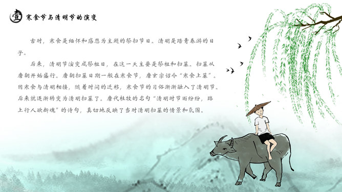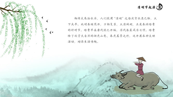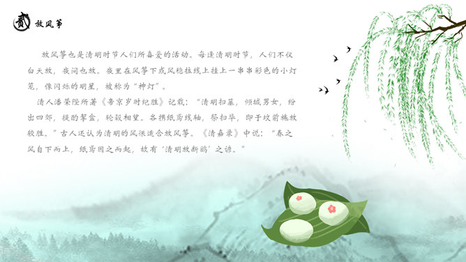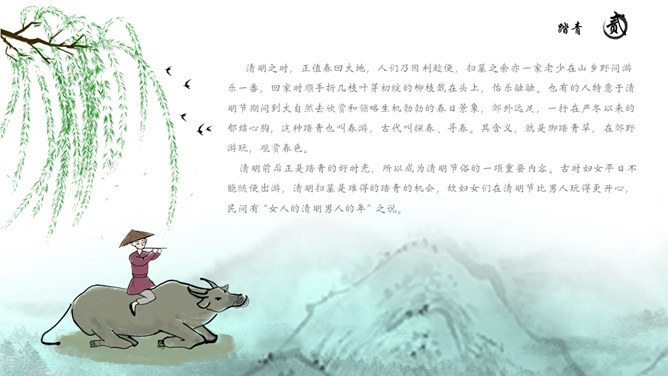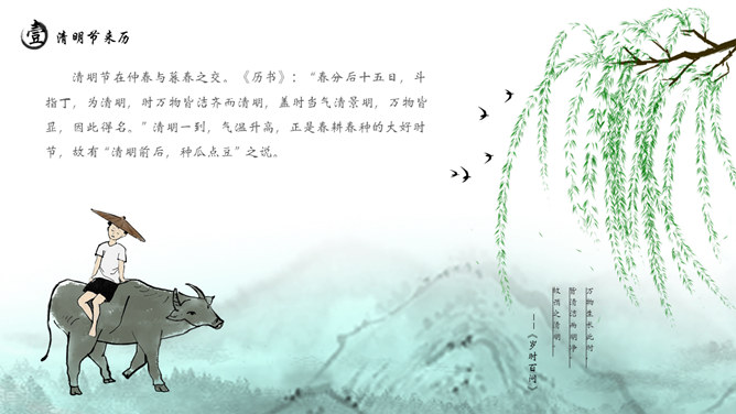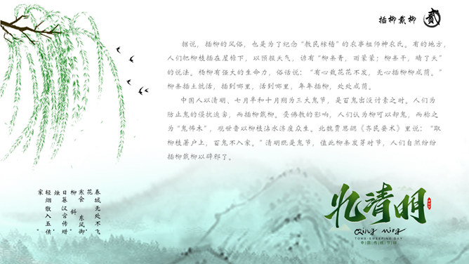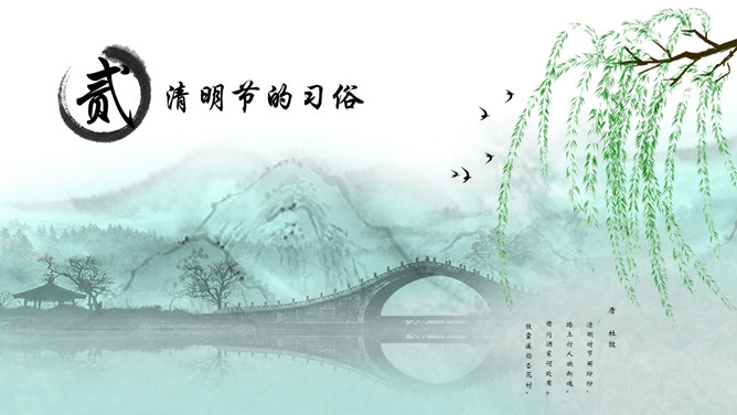 春天柳树燕子拱桥清明节PPT模板。一套清明节主题幻灯片模板,淡雅绿色主色调,春天江南柳树拱桥燕子背景。