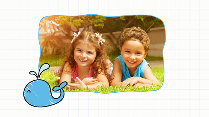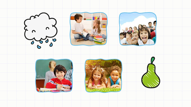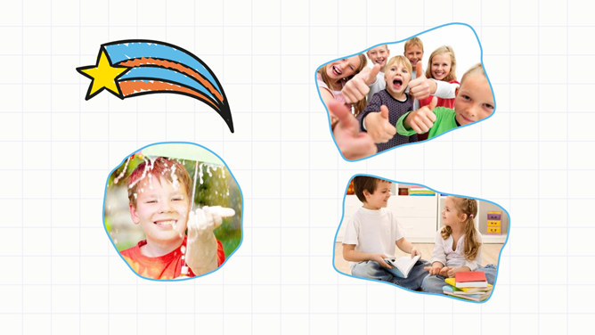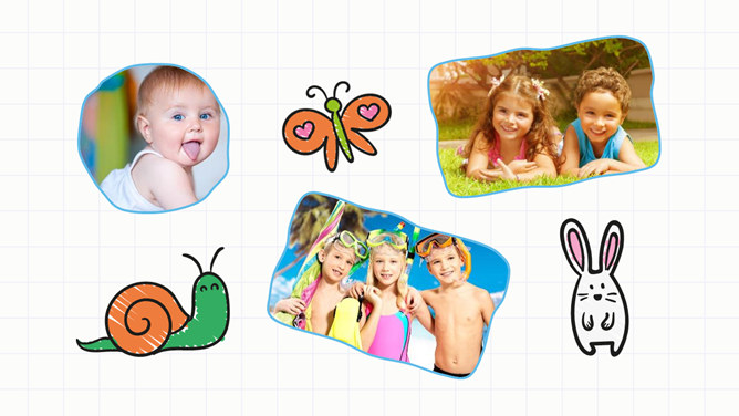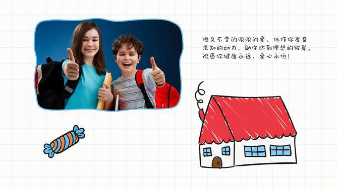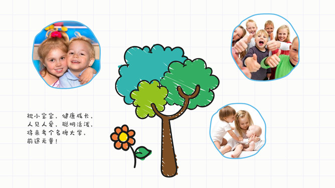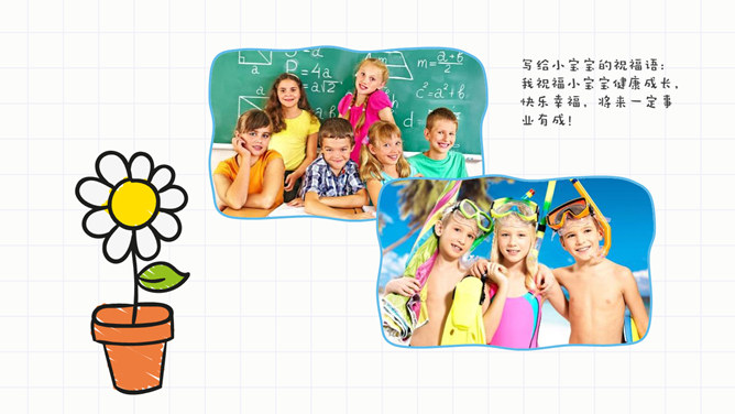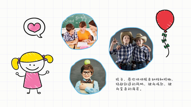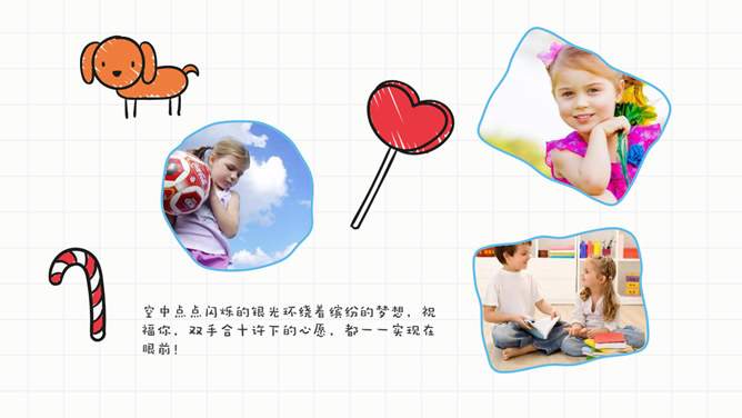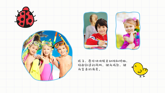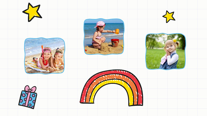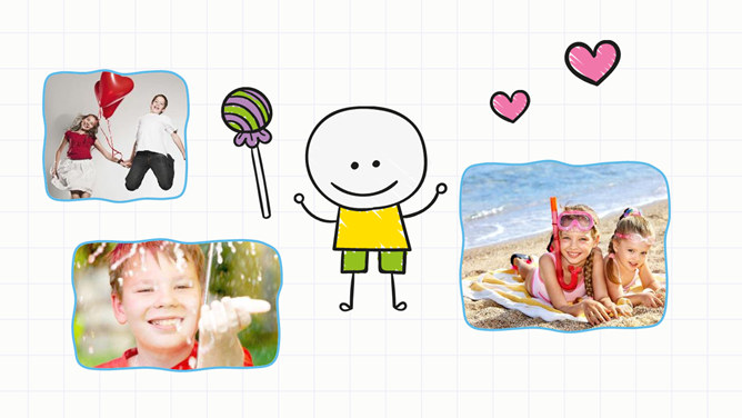 儿童画风快乐童年相册PPT模板。一套可爱卡通幻灯片模板,儿童画手绘设计风格,多图文页面,适合儿童相册制作。
