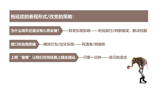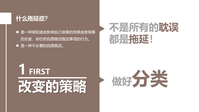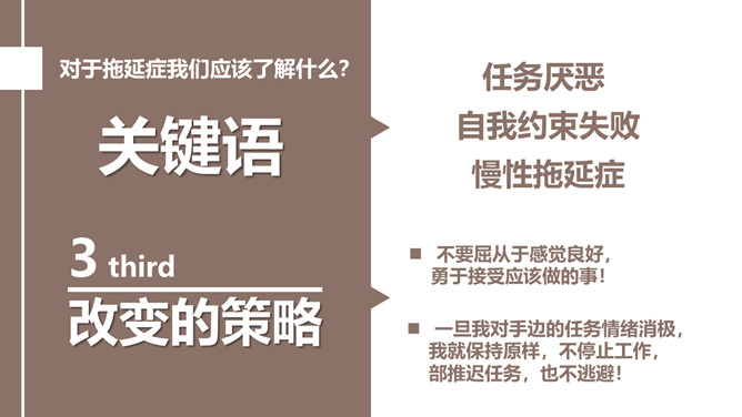 《战胜拖延症》读书笔记PPT。拖延是对生活本身的无所适从。我们在推迟自己的目标时,就相当于在拖延自己的生命。习惯不容易改变。有意识去改变,并有具体的策略,我们才能真正改变。
