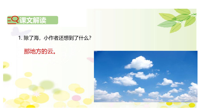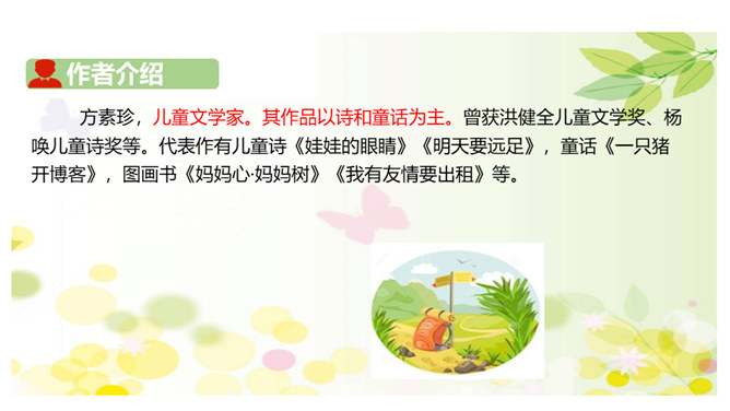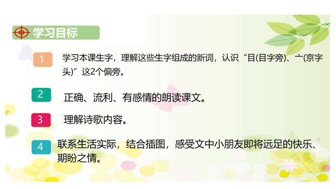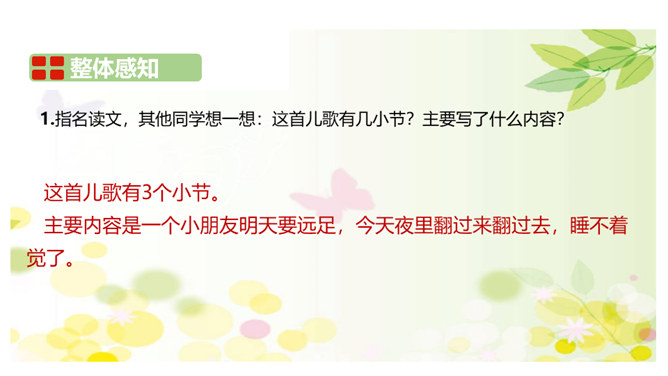 1.关于语气词“唉”的朗读。3节小诗,3次 “唉”,体现了小朋友急切、无奈、期待的心情, 可结合生活体验,感受其心情,再进行朗读。2.关于问句的朗读。3 节小诗,都以问号结尾。要结合对内容的理解进行朗读指导,带 着好奇、想象、疑惑,读好前两个问句,语气词“吗”要读得轻而短,语调微微上扬。语气词“呢”读的时候可稍微加重语气,透过声音传递出小朋友此时急不可耐的心情。所属专题:明天要远足ppt。