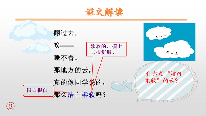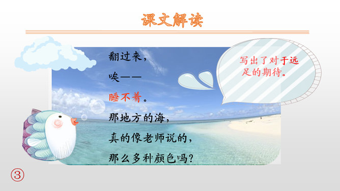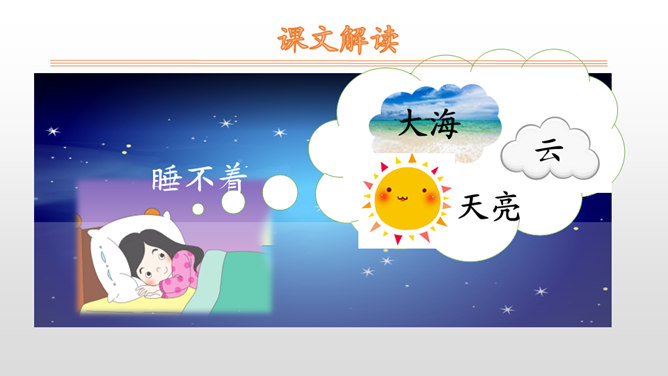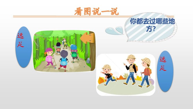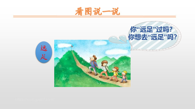 这首小诗语言凝练、传神,生动地描绘了小朋友因远足而难以入睡的情景,因此,朗读的基调是兴奋而激动的,语气是期待而盼望的。可以把自己当成诗中的主人公,想一想明天就要远足,此时心情会怎样,然后就带着这样的心情来读。朗读过程中,既要把诗读通顺,又要突出重音,尤其是“唉”“到底”等词语一定要重读。假日里爸爸要带你去旅游;学习上受了老师的表扬;明天即将登台演出。和同学们说一说吧。所属专题:明天要远足ppt。