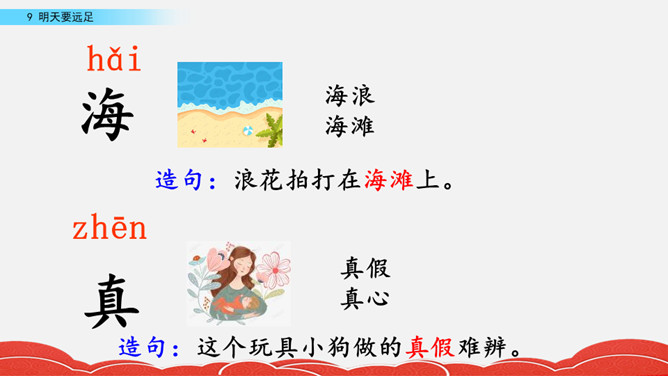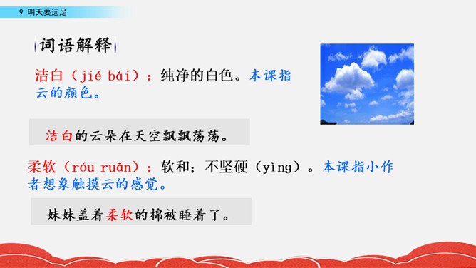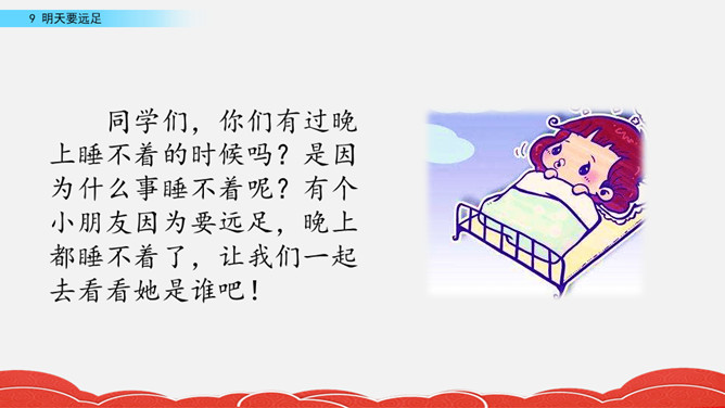 同学们,你们有过晚上睡不着的时候吗?是因为什么事睡不着呢?有个小朋友因为要远足,晚上都睡不着了,让我们一起去看看她是谁吧!说一说:这首小诗的题目是《明天要远足》,明天就要远足了,作者想到了些什么?那地方的海,那地方的云。先听老师读一遍课文,边听边感受诗歌的节奏。看完了各种颜色的海,你感受到了小女孩怎样的愿望?小女孩想看到多种颜色的海的愿望。所属专题:明天要远足ppt。