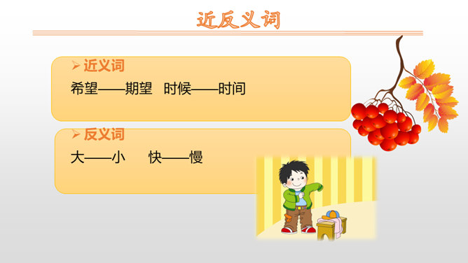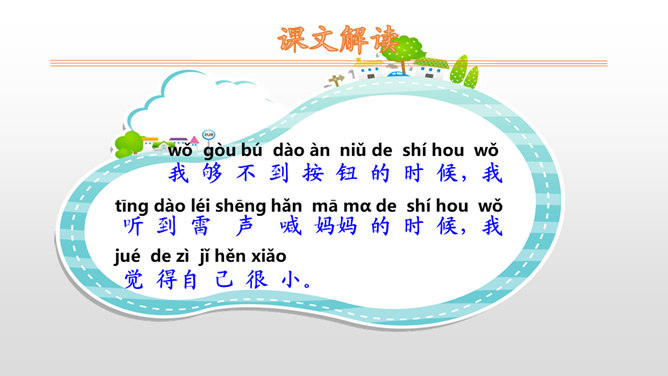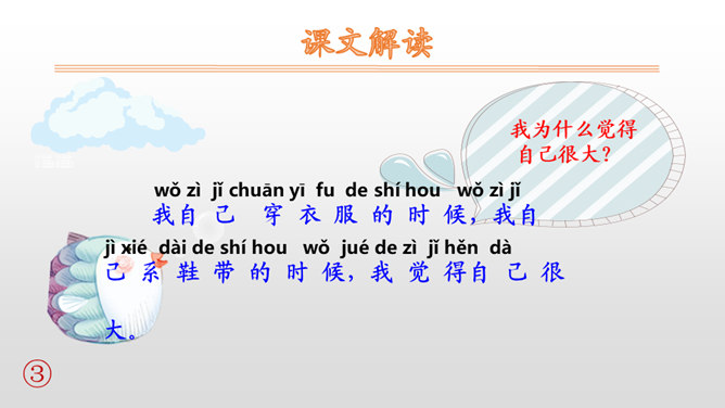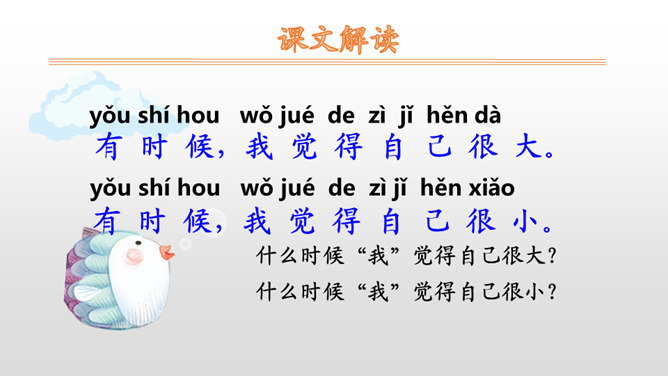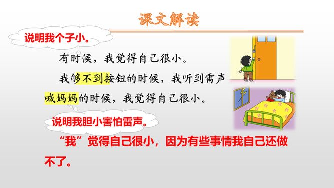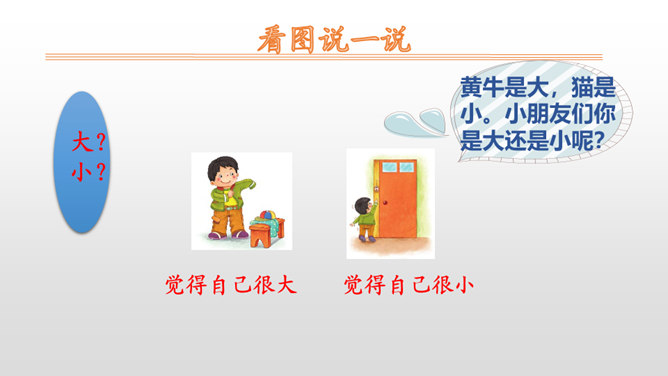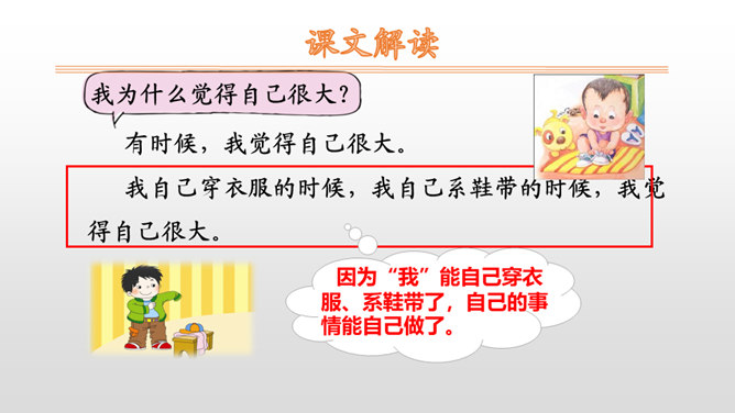 “我”自己穿衣服、系鞋带,感觉自己很大;“我”够不到按钮、害怕打雷,感觉自己很小。朗读时,语速要略慢一些,语调要平稳。其中,“我”觉得自己很大这部分,要用自豪的语气来读;“我”觉得自己很小这部分,要用胆怯、不好意思的语气来读。你什么时候觉得自己很大?什么时候觉得自己很小?先弄清文中的“我”是怎样表达自己什么时候很大,什么时候很小的。再仿照“我做什么事情,我什么感受”这样的表达顺序来说一说。所属专题:大还是小ppt。