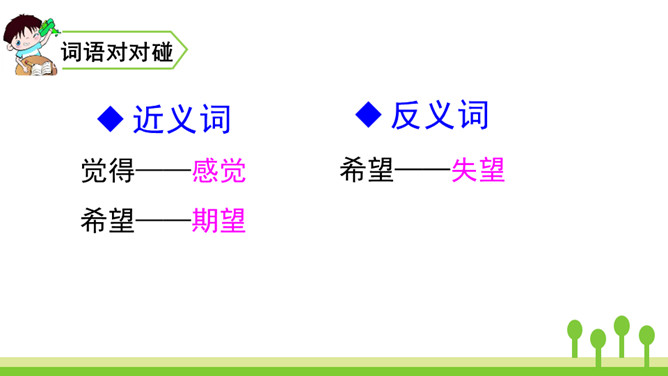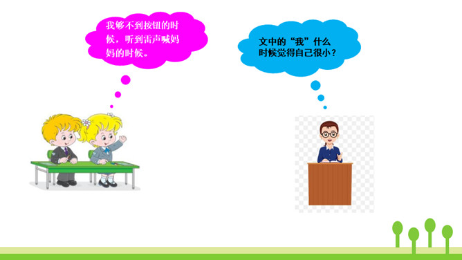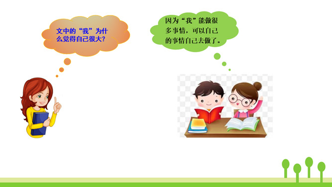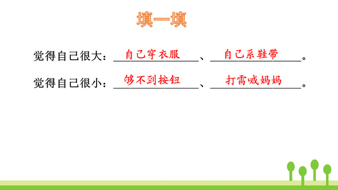 课文通过3个“有时候”和“更多的时候”把文章紧密地串联起来,形成一个有机整体。课文多处运用对比的方式来展现儿童的内心世界,儿童的内心世界是矛盾的,又是充满趣味的。在田字格中抄写本课生字。有感情地朗读课文。结束语:同学们,你们一定也盼着长大吧,这样就可以独自完成更多的事情,也能帮父母做更多的事了。从现在开始,我们要学着长大哦!这不矛盾,因为这是每个人孩童时代共有的心理,既想永远得到亲人的关爱和呵护,又想独立地生活、成长,找到自己的天地。所属专题:大还是小ppt。