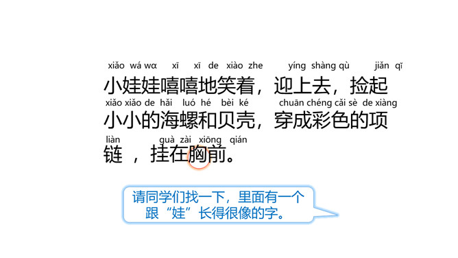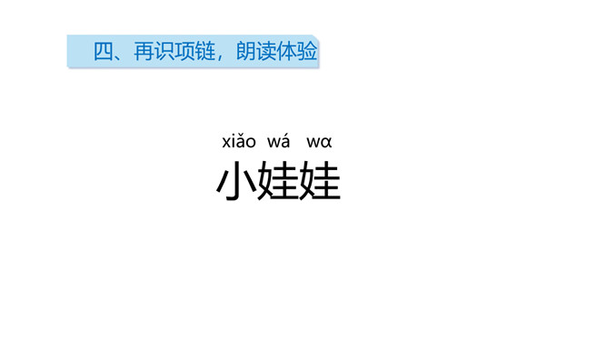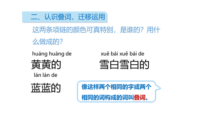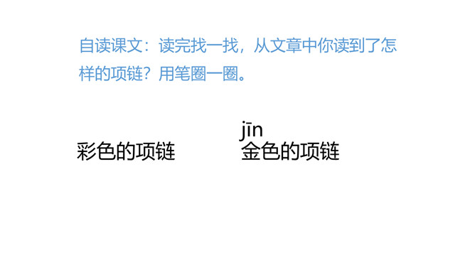 自读课文:读完找一找,从文章中你读到了怎样的项链?用笔圈一圈。这两条项链的颜色可真特别,是谁的?用什么做成的?像这样两个相同的字或两个相同的词构成的词叫叠词。小朋友们去过海边吗?让我们脱下鞋子,光着脚丫,一起去海边玩吧!“禾”做偏旁横变短,长捺变点字变瘦,小“口”偏下挨近它。又里藏着小三角,横短撇长略倾斜,撇捺交叉在中心,左右对称字舒展。所属专题:项链ppt。