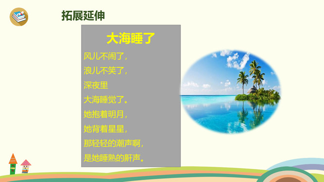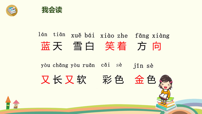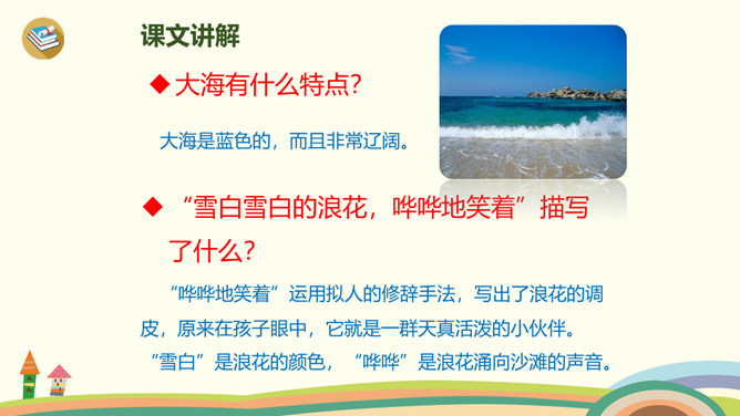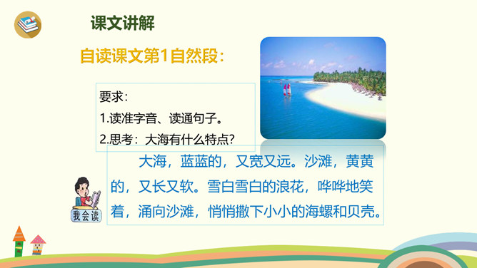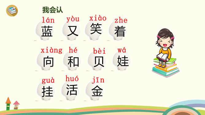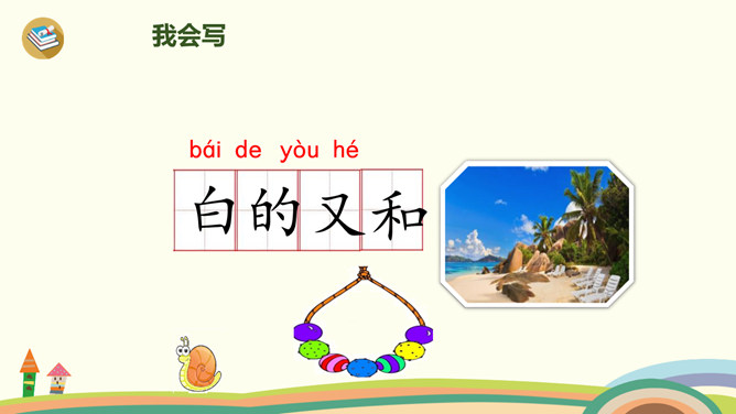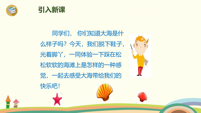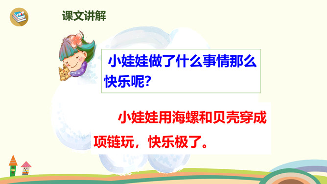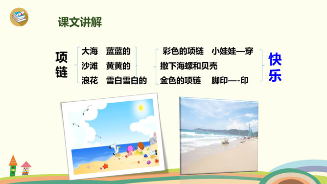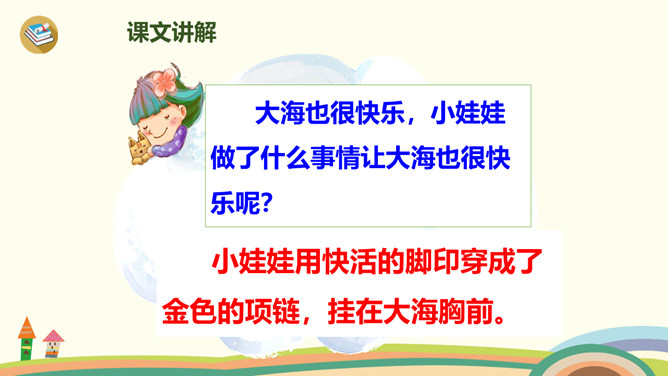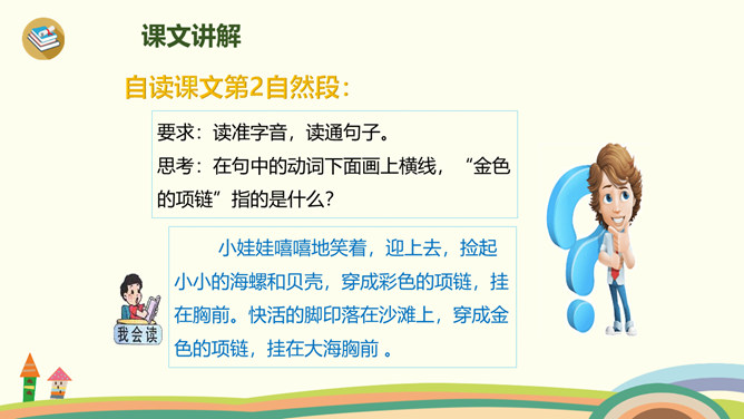 本文写了孩子们用海螺和贝壳穿成彩色项链,挂在胸前。而他们印在沙滩上的脚印,则为大海戴上了金色的项链。课文充满童趣,表现了小朋友对大自然的喜爱之情 。大海也很快乐,小娃娃做了什么事情让大海也很快乐呢?小娃娃用快活的脚印穿成了金色的项链,挂在大海胸前。小娃娃做了什么事情那么快乐呢?小娃娃用海螺和贝壳穿成项链玩,快乐极了。要求:读准字音,读通句子。思考:在句中的动词下面画上横线,“金色的项链”指的是什么?所属专题:项链ppt。