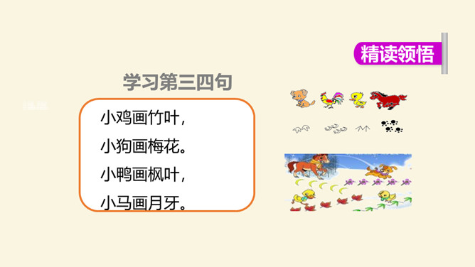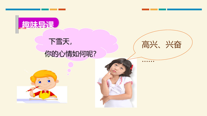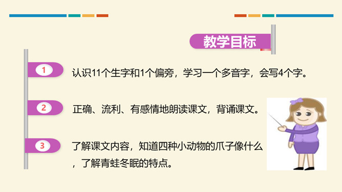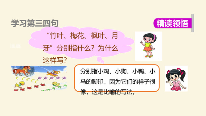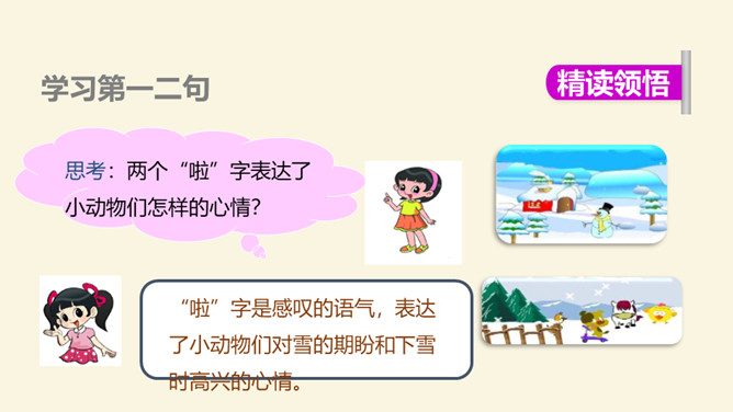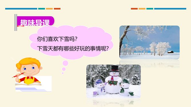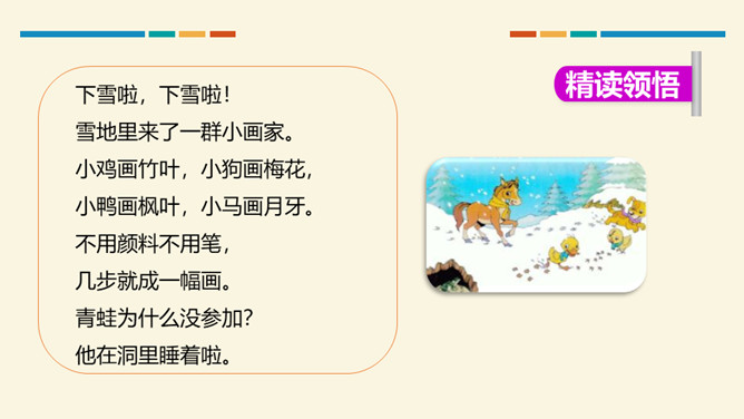 小朋友们,这篇课文通过讲小鸡、小狗、小鸭和小马在雪地里“画画”的故事,告诉我们它们的脚印形状不同,还通过写青蛙没有参加“画画”,告诉我们青蛙有冬眠的特点。认识11个生字和1个偏旁,学习一个多音字,会写4个字。了解课文内容,知道四种小动物的爪子像什么,了解青蛙冬眠的特点。正确、流利、有感情地朗读课文,背诵课文。你们喜欢下雪吗?下雪天都有哪些好玩的事情呢?所属专题:雪地里的小画家ppt。