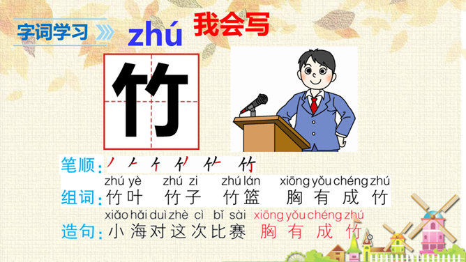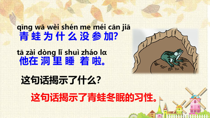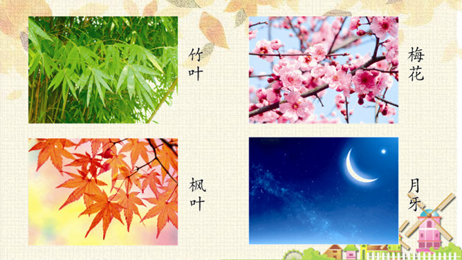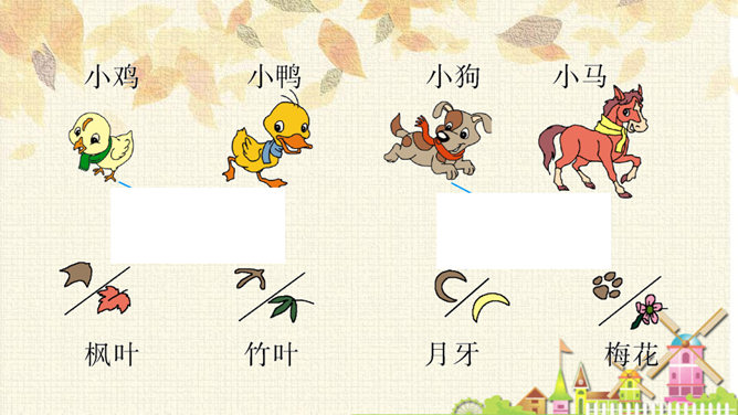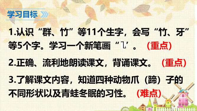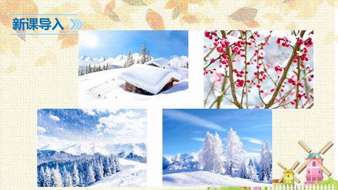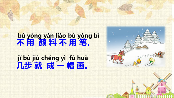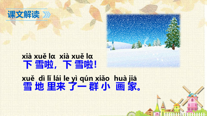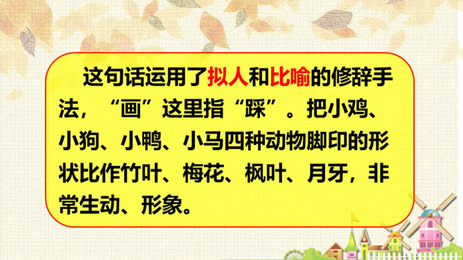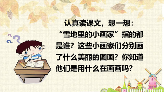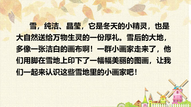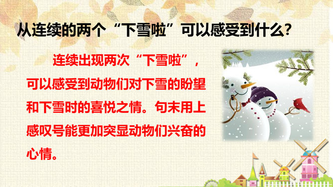 从连续的两个“下雪啦”可以感受到什么?连续出现两次“下雪啦”,可以感受到动物们对下雪的盼望和下雪时的喜悦之情。句末用上感叹号能更加突显动物们兴奋的心情。认真读课文,想一想:“雪地里的小画家”指的都是谁?这些小画家们分别画了什么美丽的图画?你知道他们是用什么在画画吗?这句话运用了拟人和比喻的修辞手法,“画”这里指“踩”。把小鸡、小狗、小鸭、小马四种动物脚印的形状比作竹叶、梅花、枫叶、月牙,非常生动、形象。所属专题:雪地里的小画家ppt。