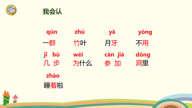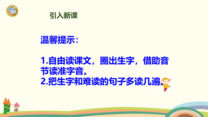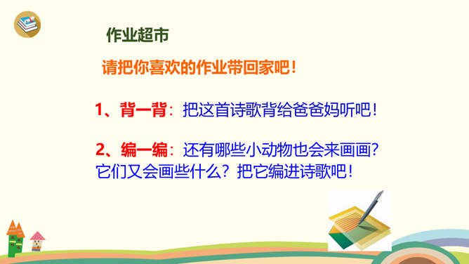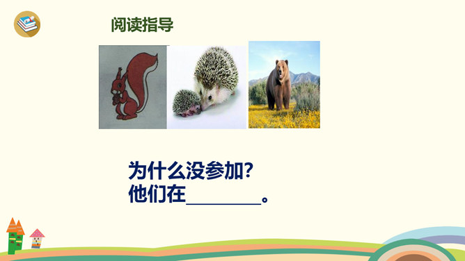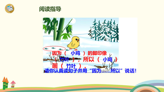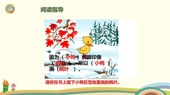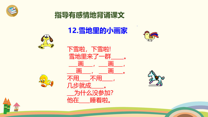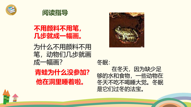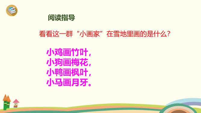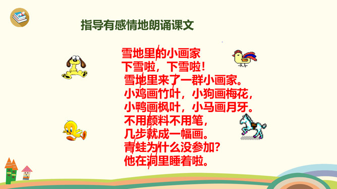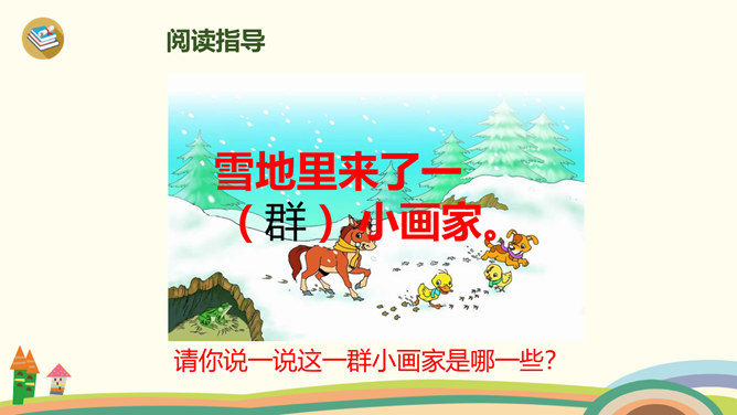 温馨提示:1.自由读课文,圈出生字,借助音节读准字音。2.把生字和难读的句子多读几遍。请你说一说这一群小画家是哪一些?请把你喜欢的作业带回家吧!1、背一背:把这首诗歌背给爸爸妈听吧!2、编一编:还有哪些小动物也会来画画?它们又会画些什么?把它编进诗歌吧!不用颜料不用笔,几步就成一幅画。为什么不用颜料不用笔,动物们几步就画成一幅画?青蛙为什么没参加?他在洞里睡着啦。所属专题:雪地里的小画家ppt。