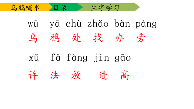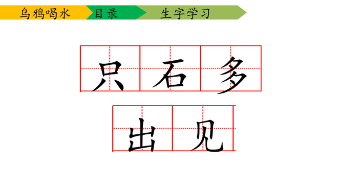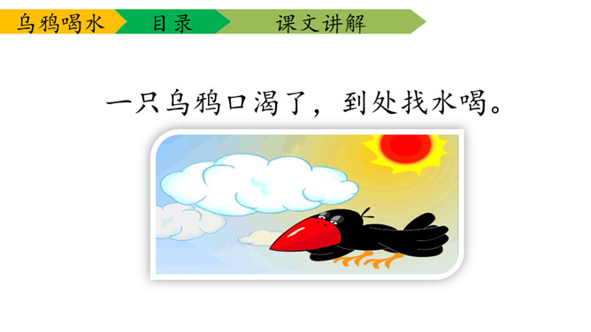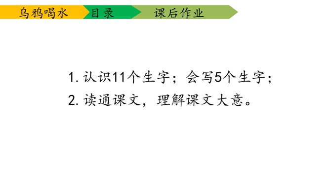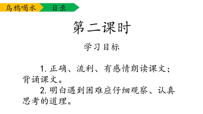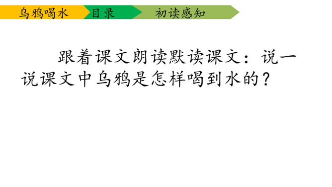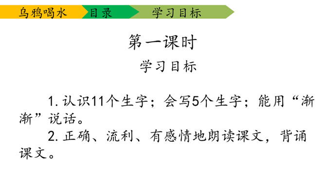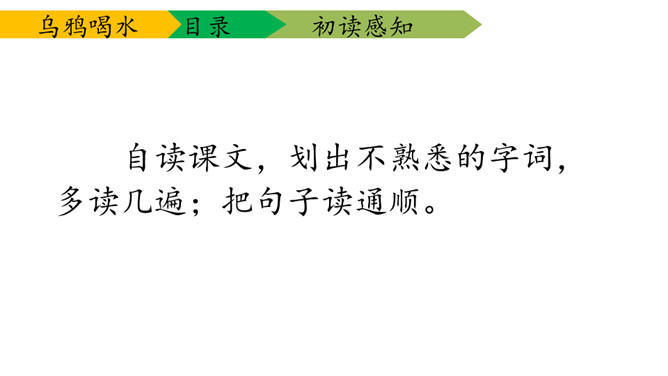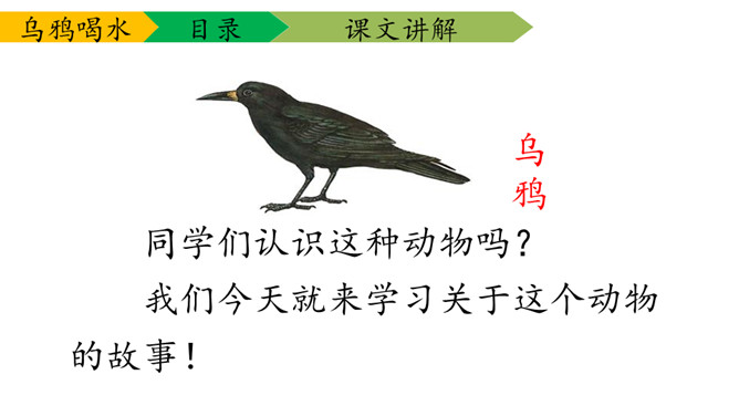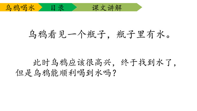 自读课文,划出不熟悉的字词,多读几遍;把句子读通顺。1.认识11个生字;会写5个生字;能用“渐渐”说话。2.正确、流利、有感情地朗读课文,背诵课文。跟着课文朗读默读课文:说一说课文中乌鸦是怎样喝到水的?1.正确、流利、有感情朗读课文;背诵课文。2.明白遇到困难应仔细观察、认真思考的道理。同学们认识这种动物吗?我们今天就来学习关于这个动物的故事!如果你是乌鸦,你会怎么办呢?你会放弃吗?遇到问题和困难,我们要学会想办法解决,我们来看看乌鸦想到办法了没有。乌鸦善于观察,勤于思考,它会怎么利用石子呢?所属专题:乌鸦喝水ppt。