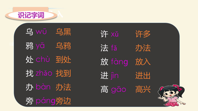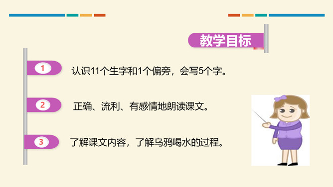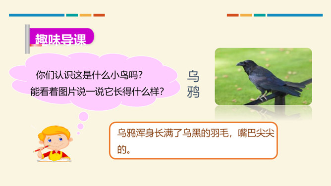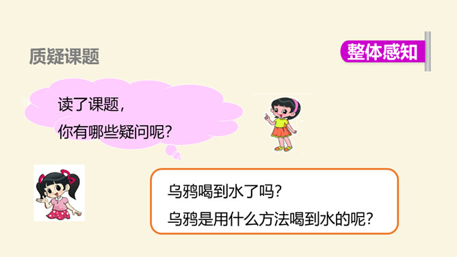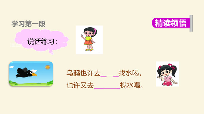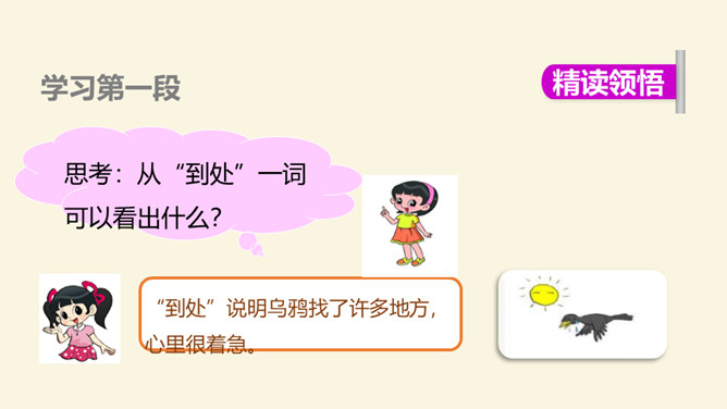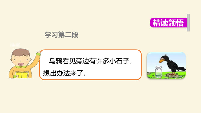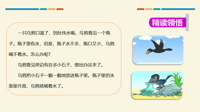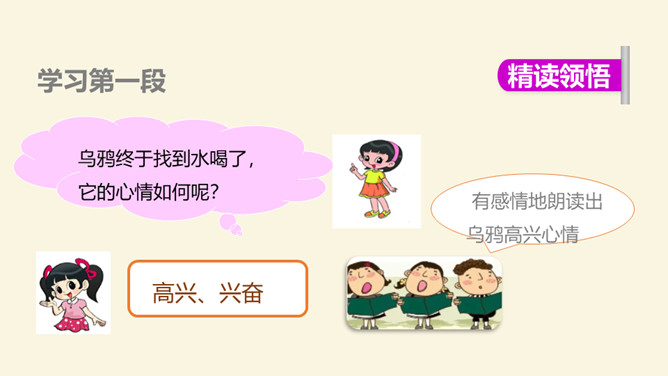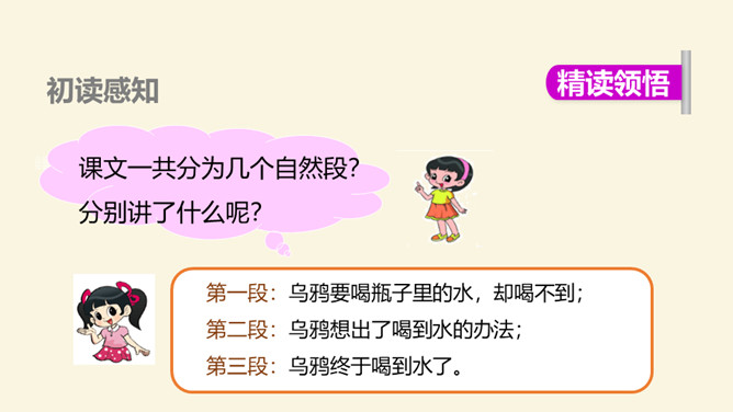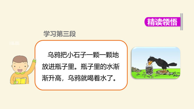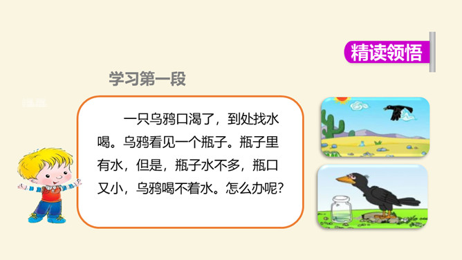 你们认识这是什么小鸟吗?能看着图片说一说它长得什么样?乌鸦浑身长满了乌黑的羽毛,嘴巴尖尖的。认真倾听老师范读课文,注意不认识的生字。借助拼音自读课文,一边读一边动笔圈画出本课的生字。课文一共分为几个自然段?分别讲了什么呢?第一段:乌鸦要喝瓶子里的水,却喝不到;第二段:乌鸦想出了喝到水的办法;第三段:乌鸦终于喝到水了。思考:从“到处”一词可以看出什么?“到处”说明乌鸦找了许多地方,心里很着急。所属专题:乌鸦喝水ppt。
