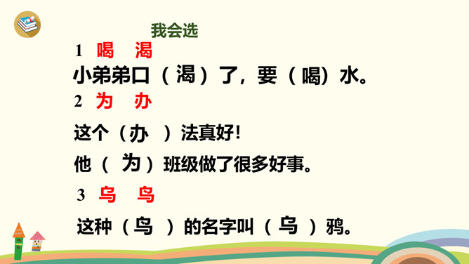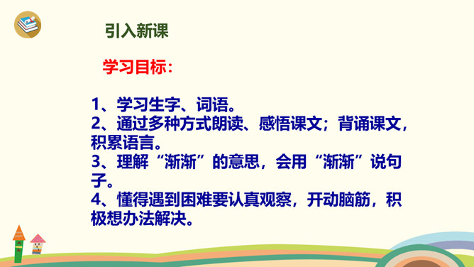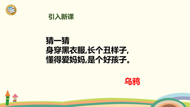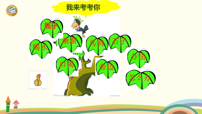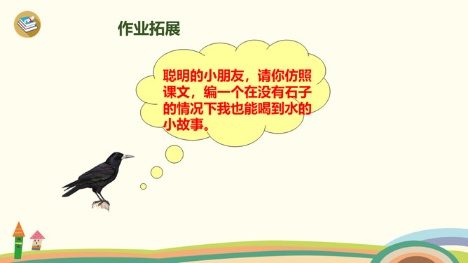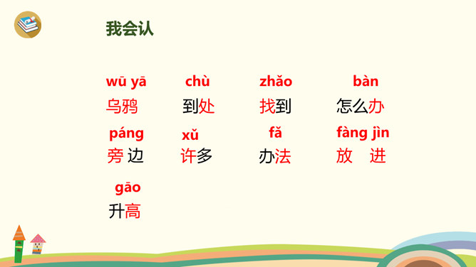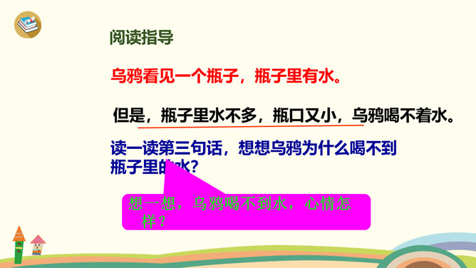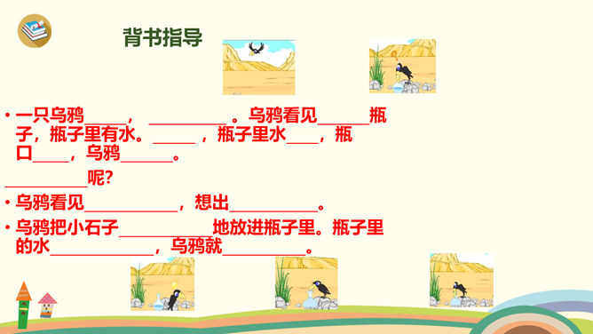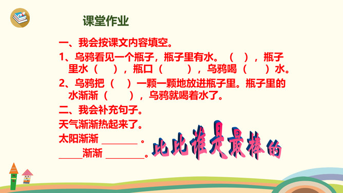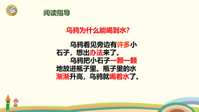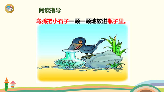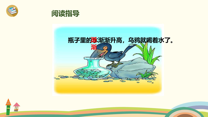 学习目标:1、学习生字、词语。2、通过多种方式朗读、感悟课文;背诵课文,积累语言。3、理解“渐渐”的意思,会用“渐渐”说句子。4、懂得遇到困难要认真观察,开动脑筋,积极想办法解决。1、同学们一边看一边思考:课文主要讲了乌鸦的什么事?2、自由朗读第一自然段,数一数第一自然段共有几句话?3、读一读第一句话,想一想,乌鸦为了找水,飞过了哪些地方呢?4、读一读第二句,乌鸦找到水时心情怎样?所属专题:乌鸦喝水ppt。