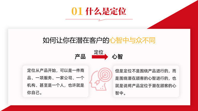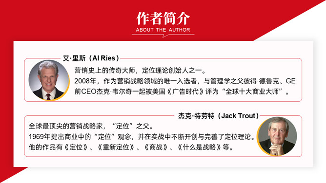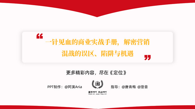 《定位》读书笔记PPT。如果只看一本营销书,首选《定位》。一针见血的商业实战手册,解密营销混战的误区、陷阱与机遇。