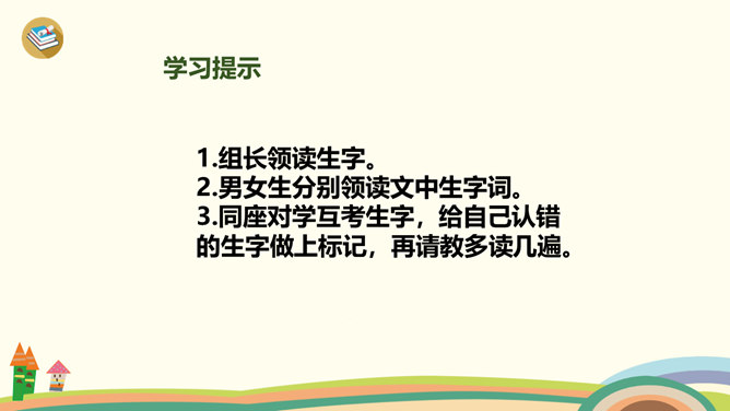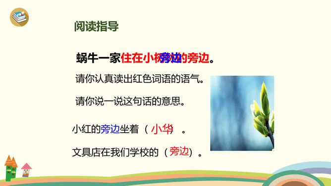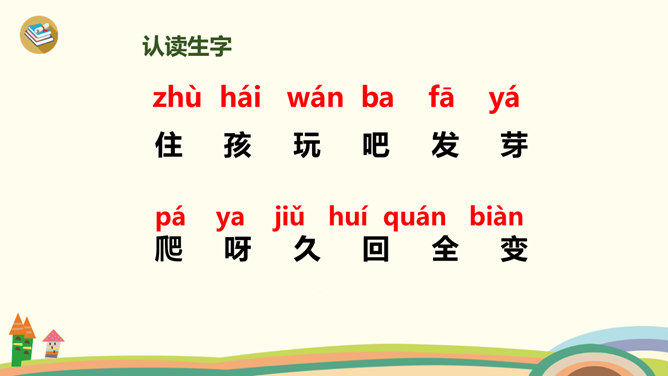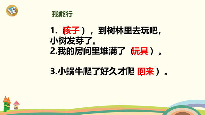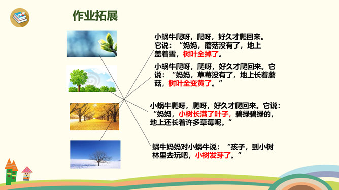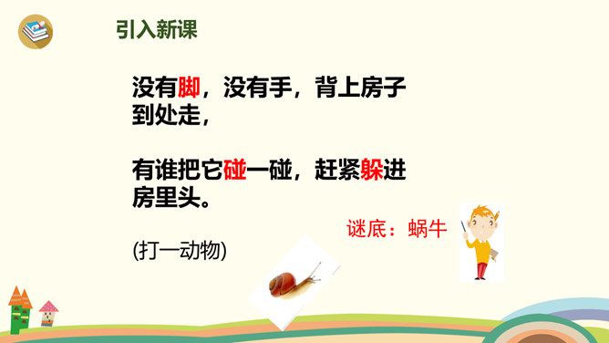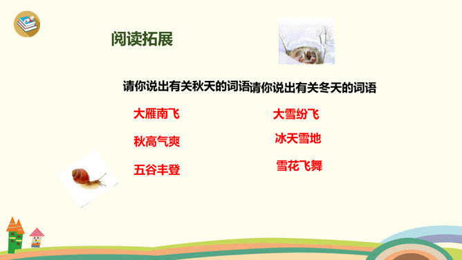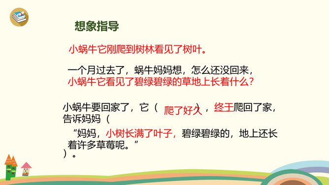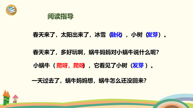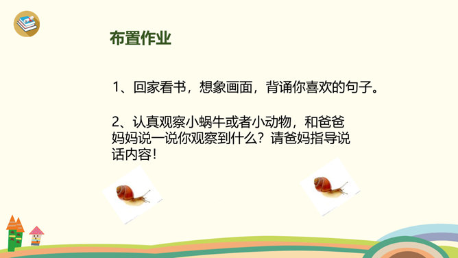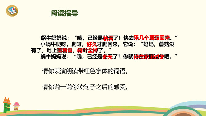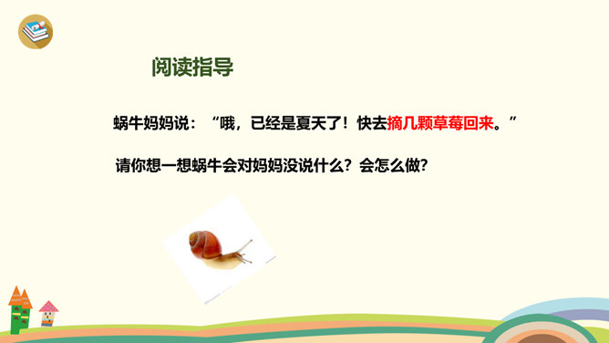 1.组长领读生字。 2.男女生分别领读文中生字词。3.同座对学互考生字,给自己认错的生字做上标记,再请教多读几遍。蜗牛妈妈说:“哦,已经是夏天了!快去摘几颗草莓回来。”请你想一想蜗牛会对妈妈没说什么?会怎么做?1、回家看书,想象画面,背诵你喜欢的句子。2、认真观察小蜗牛或者小动物,和爸爸妈妈说一说你观察到什么?请爸妈指导说话内容! 请你说出有关秋天的词语。所属专题:小蜗牛ppt。