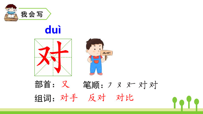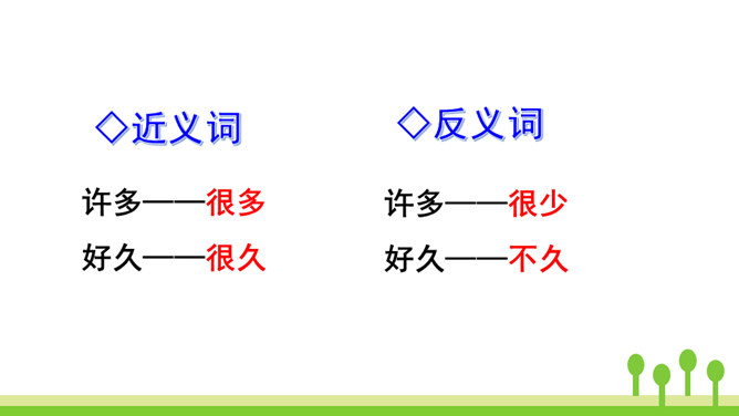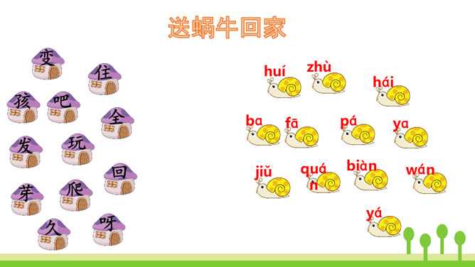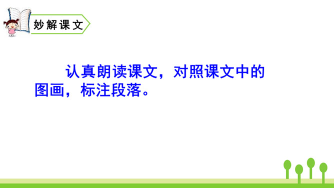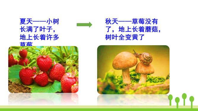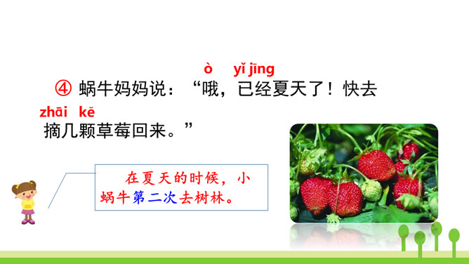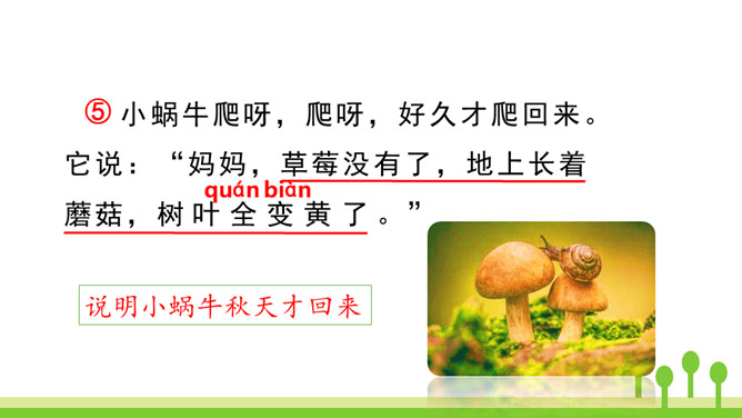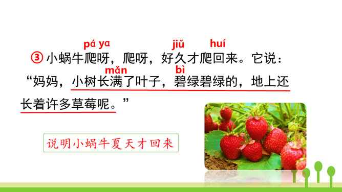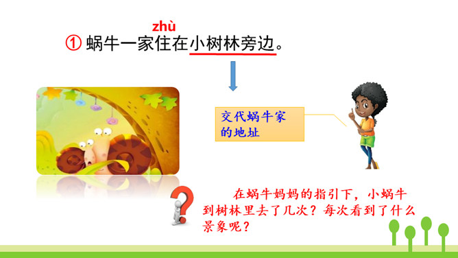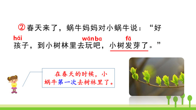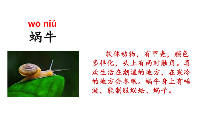 本文是一篇童话故事,以一只可爱的小蜗牛和它慈爱的妈妈之间有趣的对话呈现故事情节。小蜗牛在妈妈的提示下去树林玩,由于爬得慢,总是错过原来的季节,看到了下一个季节的风景。课文借助小蜗牛先后三次去树林里的故事,帮助学生了解四季的不同特点以及蜗牛爬得慢的特点。结束语:四季的景色各不相同,让我们擦亮眼睛,去发现大自然的美丽吧!对照图画,认真朗读课文。默写本课生字词。所属专题:小蜗牛ppt。