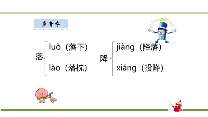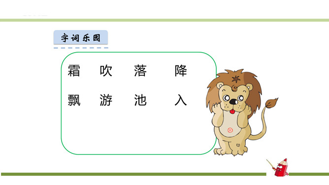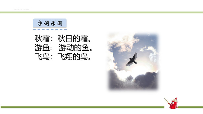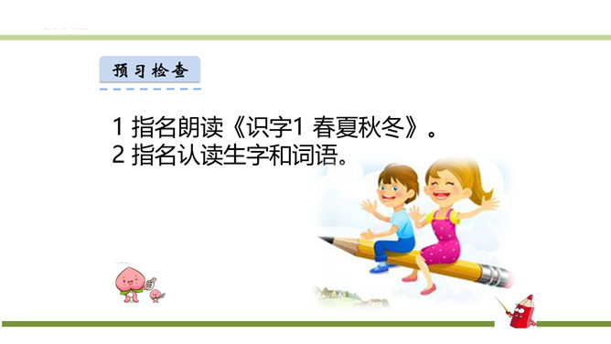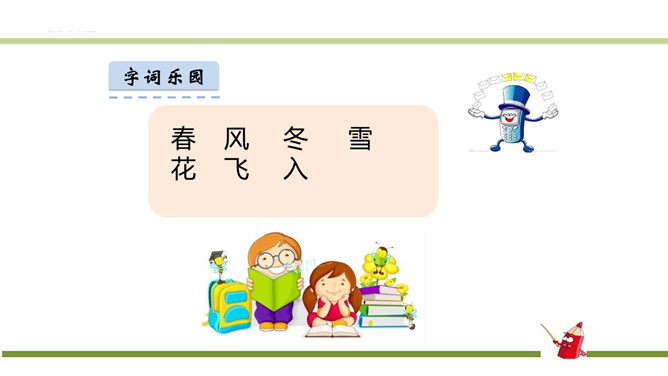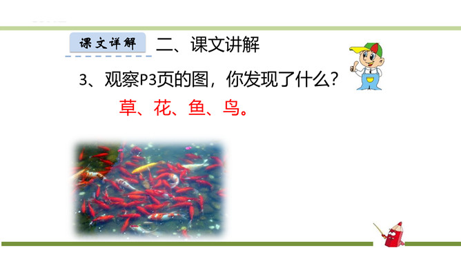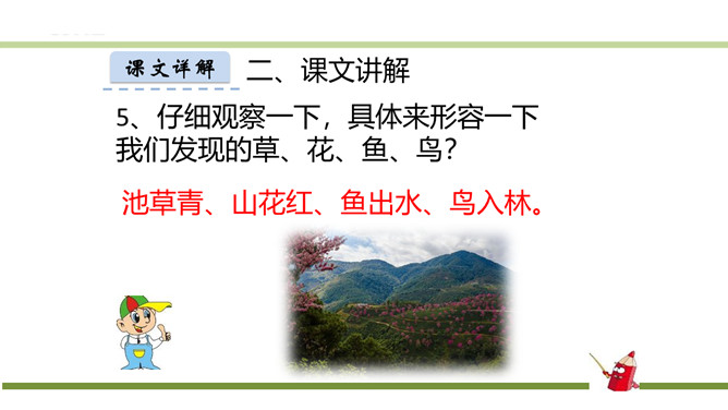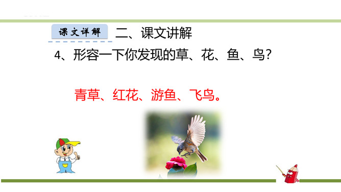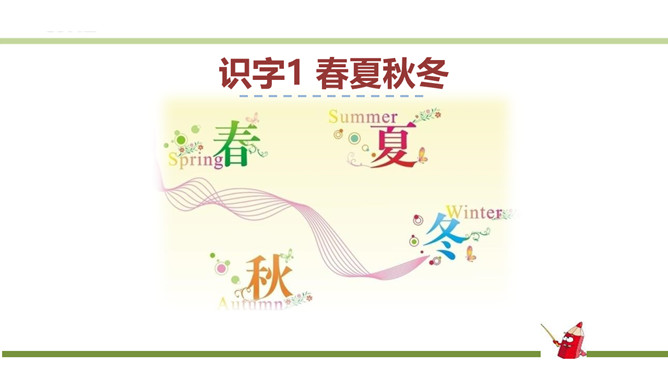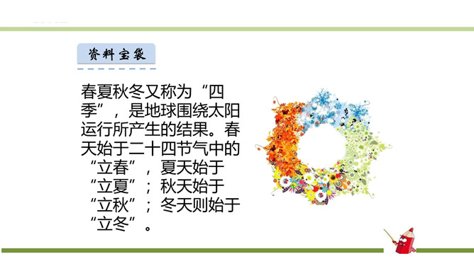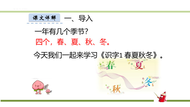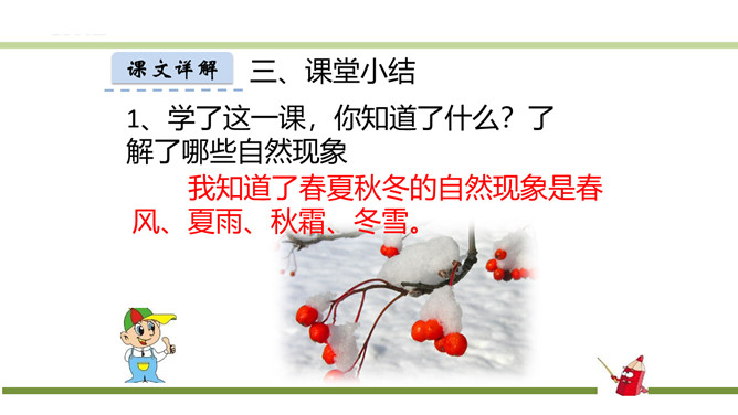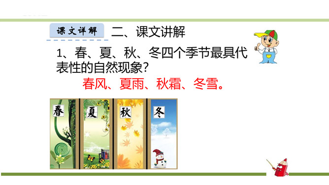 指名朗读《识字1 春夏秋冬》。指名认读生字和词语。春、夏、秋、冬四个季节最具代表性的自然现象?春风、夏雨、秋霜、冬雪。谁能用三个字形容一下图上的内容?春风吹、夏雨落、秋霜降、冬雪飘。观察P3页的图,你发现了什么?草、花、鱼、鸟。形容一下你发现的草、花、鱼、鸟?青草、红花、游鱼、飞鸟。仔细观察一下,具体来形容一下我们发现的草、花、鱼、鸟?池草青、山花红、鱼出水、鸟入林。所属专题:春夏秋冬ppt。