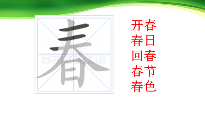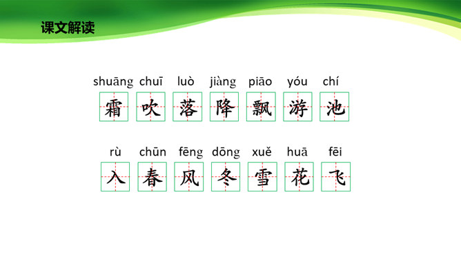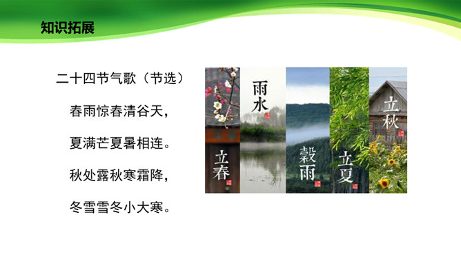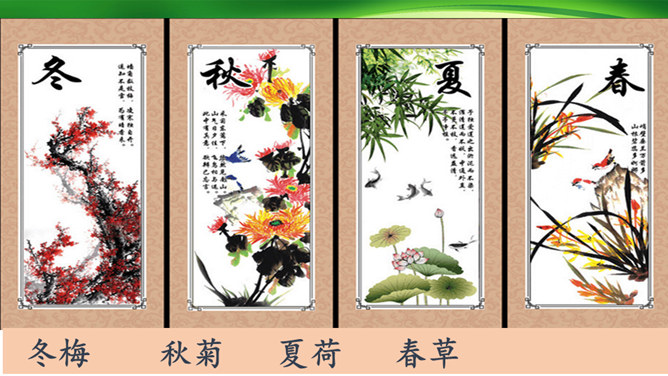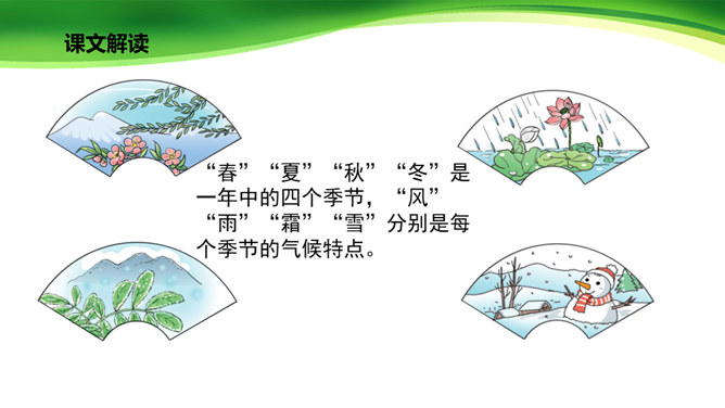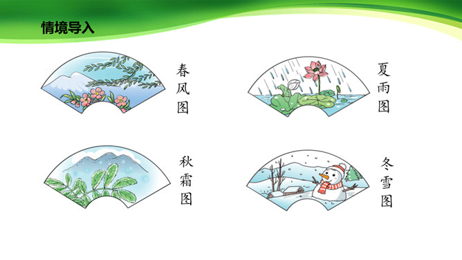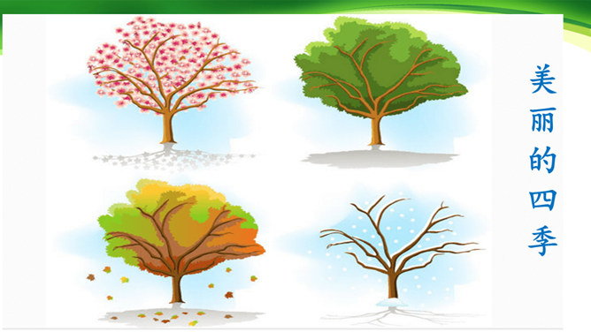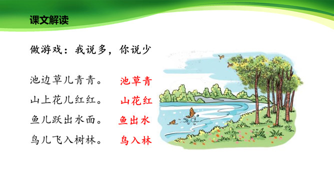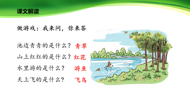 做游戏:我来问,你来答。池边青青的是什么?山上红红的是什么?水里游的是什么?天上飞的是什么?大自然是那么美丽,快拿起你的画笔来表达你对它的爱吧!“春”“夏”“秋”“冬”是一年中的四个季节,“风”“雨”“霜”“雪”分别是每个季节的气候特点。从这幅图中你看到了什么?所属专题:春夏秋冬ppt。