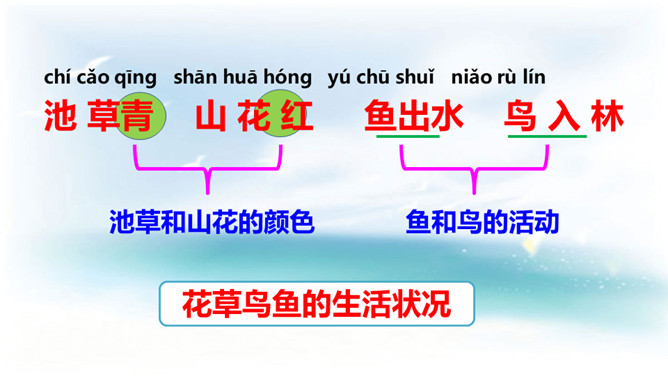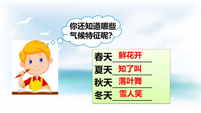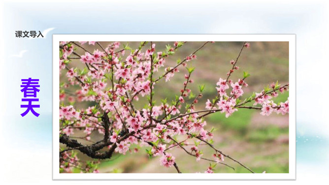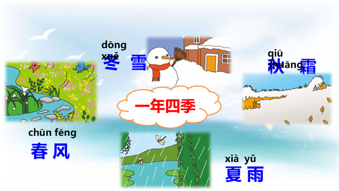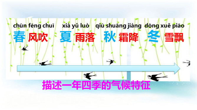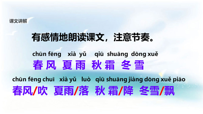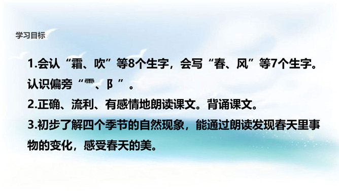 会认“霜、吹”等8个生字,会写“春、风”等7个生字。认识偏旁“⻗、阝”。正确、流利、有感情地朗读课文。背诵课文。初步了解四个季节的自然现象,能通过朗读发现春天里事物的变化,感受春天的美。所属专题:春夏秋冬ppt。