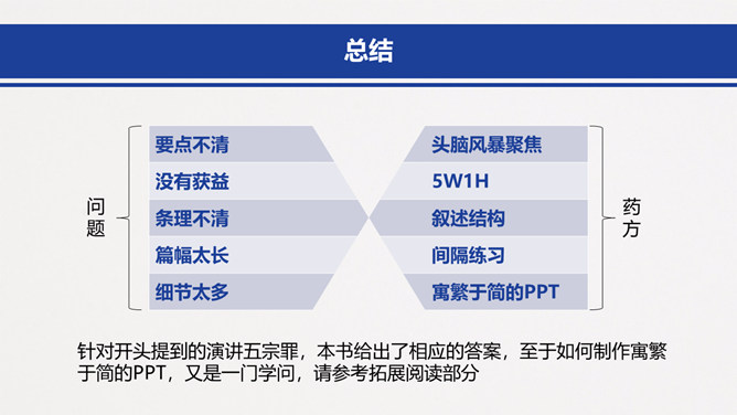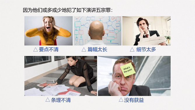 《魏斯曼演讲圣经说的艺术》读书笔记PPT。为什么有的演讲精彩纷呈,有的令人昏昏欲睡?因为他们或多或少地犯了如下演讲五宗罪:要点不清、篇幅太长、细节太多、条理不清、没有获益。
