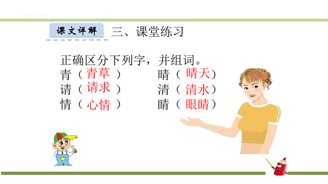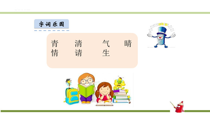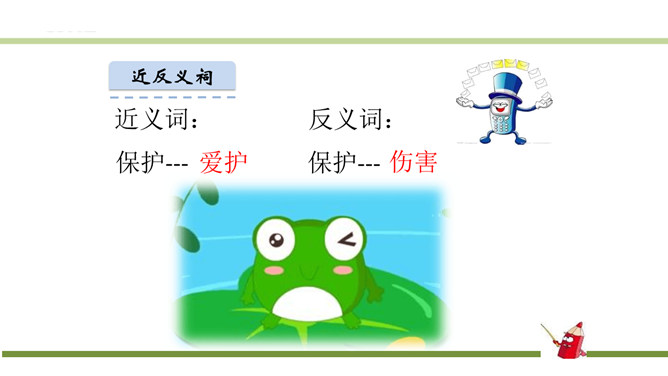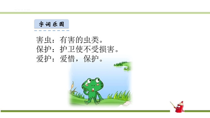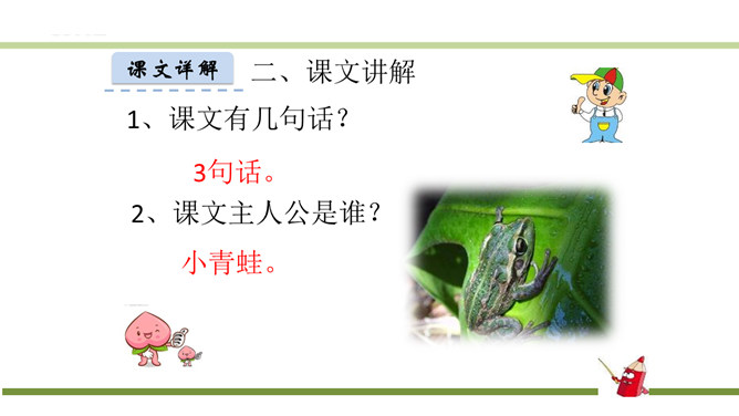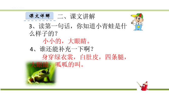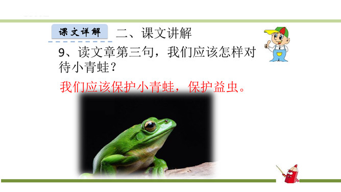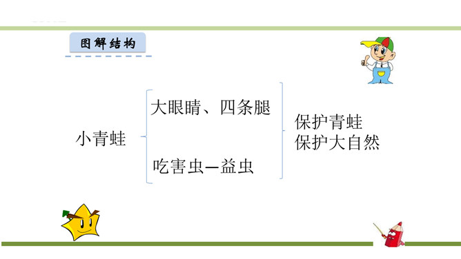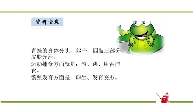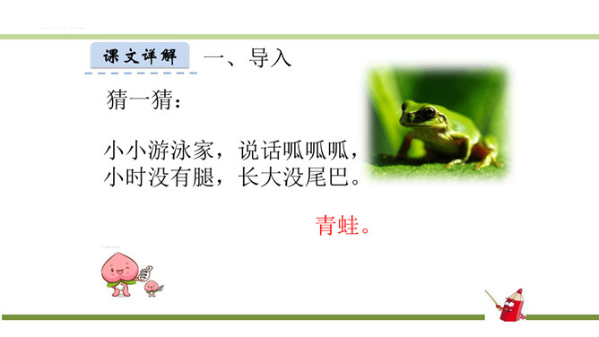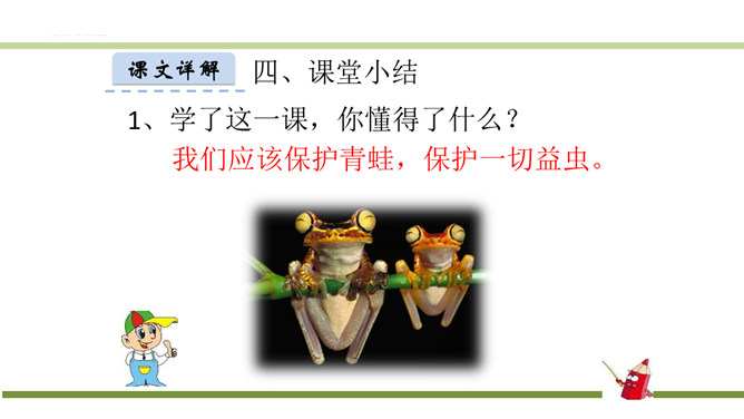 指名认读生字和词语。指名朗读《识字3 小青蛙》。青蛙的身体分头、躯干、四肢三部分,皮肤光滑。运动捕食方面就是:游、跳、用舌捕食。繁殖发育方面是:卵生、发育变态。课文有几句话?3句话。课文主人公是谁?小青蛙。读第一句话,你知道小青蛙是什么样子的?小小的,大眼睛。谁还能补充一下啊?身穿绿衣裳,白肚皮,四条腿,大眼睛,呱呱的叫。你还知道哪些益虫?猫头鹰、蜻蜓、啄木鸟、壁虎……所属专题:小青蛙ppt。