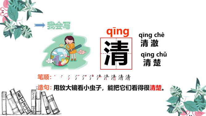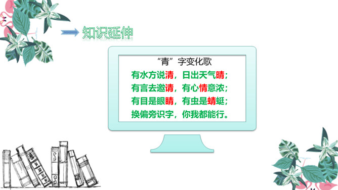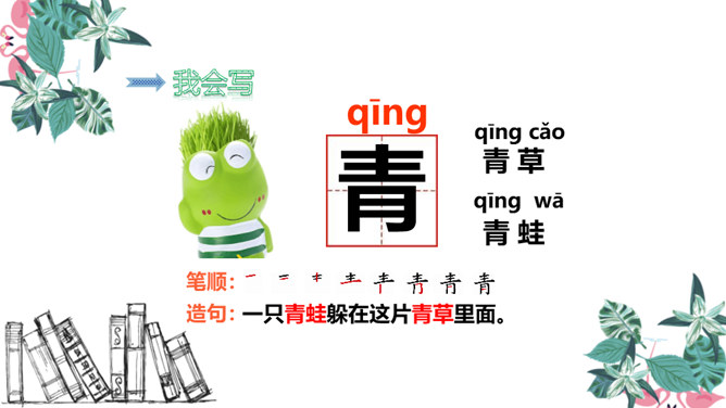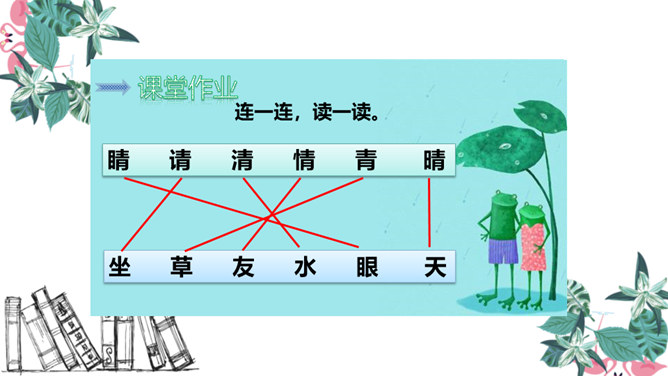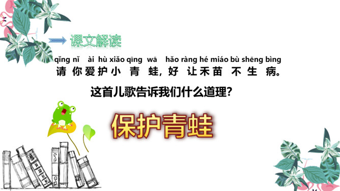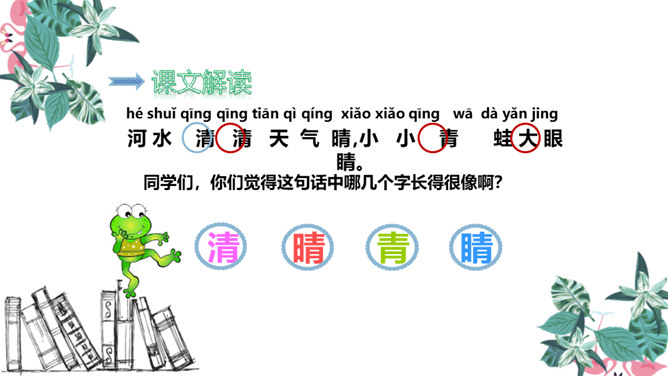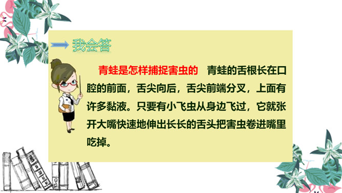 青蛙是怎样捕捉害虫的 青蛙的舌根长在口腔的前面,舌尖向后,舌尖前端分叉,上面有许多黏液。只要有小飞虫从身边飞过,它就张开大嘴快速地伸出长长的舌头把害虫卷进嘴里吃掉。有感情地朗读课文,注意节奏。同学们,你们觉得这句话中哪几个字长得很像啊?同学们,你们还知道哪些“青”字旁的字?1.把今天的课文朗读给爸爸妈妈听。2.抄写今天的生字词。3.你还知道哪些小动物需要保护吗?和你的小伙伴一起说一说吧。所属专题:小青蛙ppt。