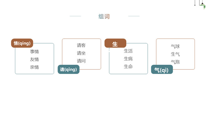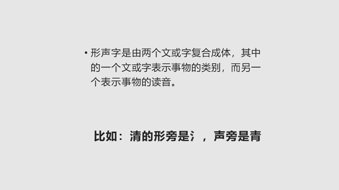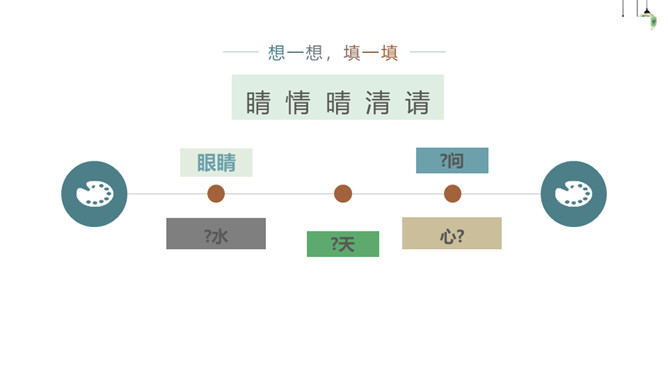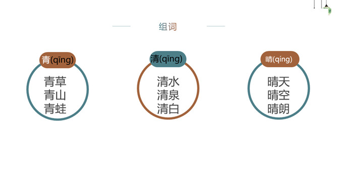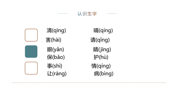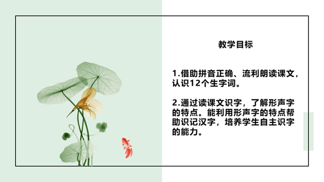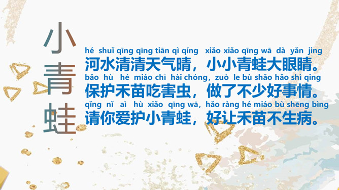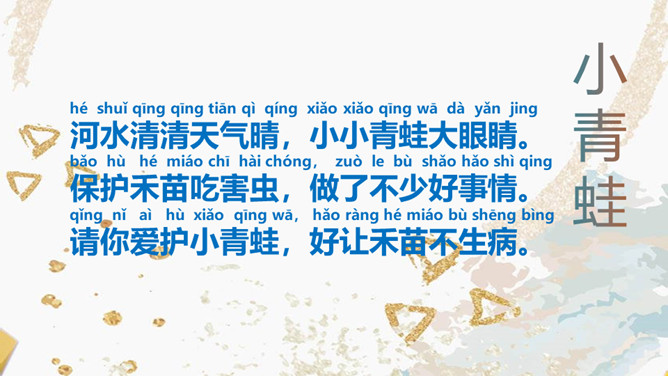 教学目标:1.借助拼音正确、流利朗读课文,认识12个生字词。2.通过读课文识字,了解形声字的特点。能利用形声字的特点帮助识记汉字,培养学生自主识字的能力。河水清清天气晴,小小青蛙大眼睛。保护禾苗吃害虫,做了不少好事情。请你爱护小青蛙,好让禾苗不生病。形声字是由两个文或字复合成体,其中的一个文或字表示事物的类别,而另一个表示事物的读音。所属专题:小青蛙ppt。