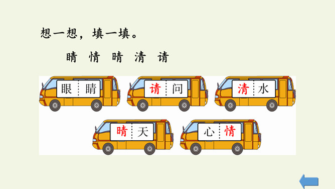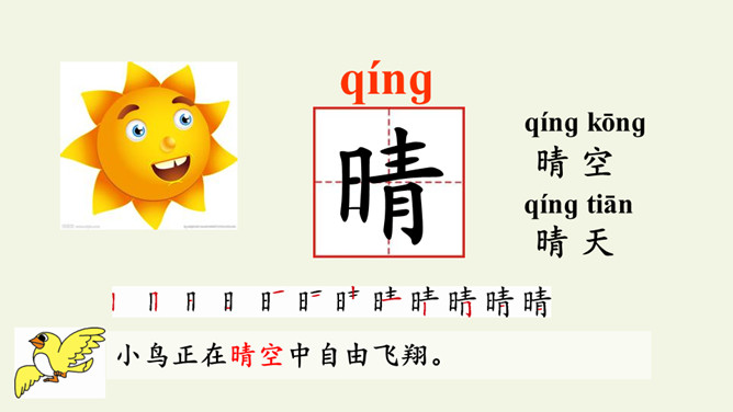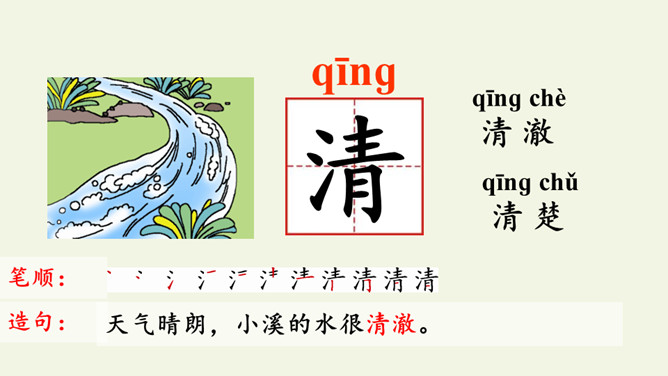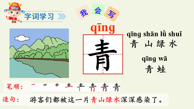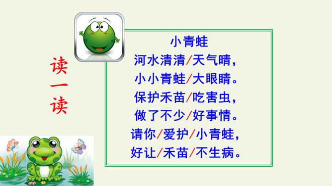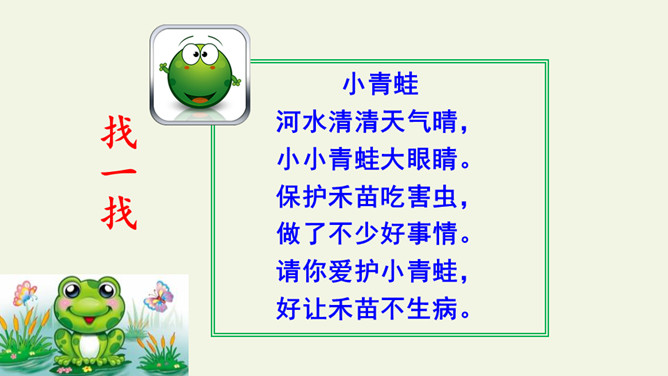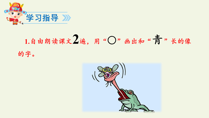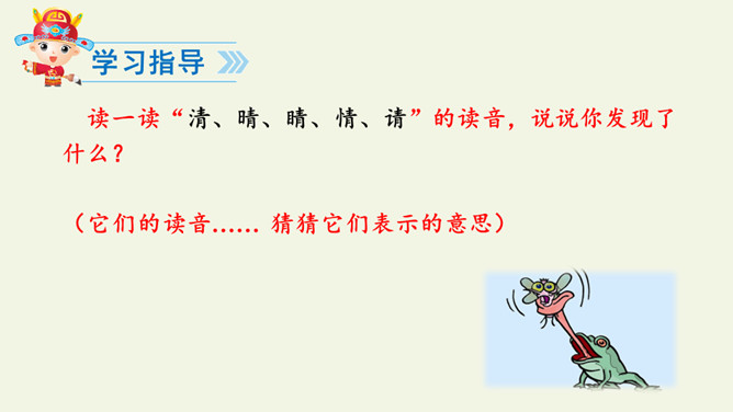 学习指导:1.自由朗读课文2遍,用“○”画出和“青”长的像的字。小青蛙。河水清清天气晴,小小青蛙大眼睛。保护禾苗吃害虫,做了不少好事情。请你爱护小青蛙,好让禾苗不生病。读一读“清、晴、睛、情、请”的读音,说说你发现了什么?(它们的读音…… 猜猜它们表示的意思)把今天的课文朗读给爸爸妈妈听。所属专题:小青蛙ppt。