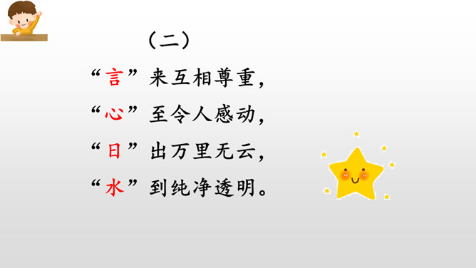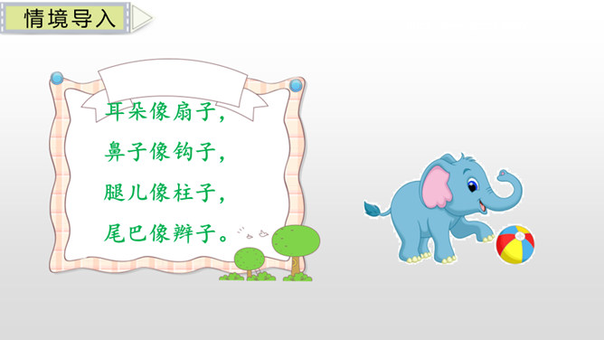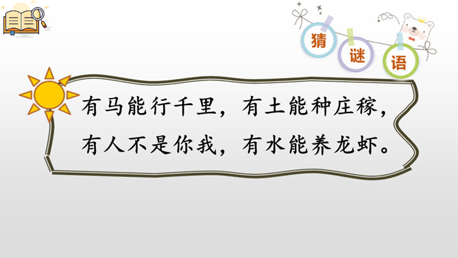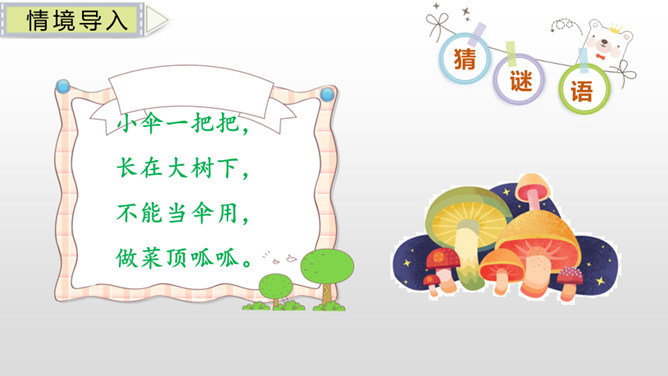 同学们,这件我们继续猜了有趣的字谜,感受到了猜字谜的乐趣,学习了猜字谜的方法,课下,同学们可以把这些字谜带回家,让爸爸妈妈也来猜一猜。小伞一把把,长在大树下,不能当伞用,做菜顶呱呱。耳朵像扇子,鼻子像钩子,腿儿像柱子,尾巴像辫子。所属专题:猜字谜ppt。